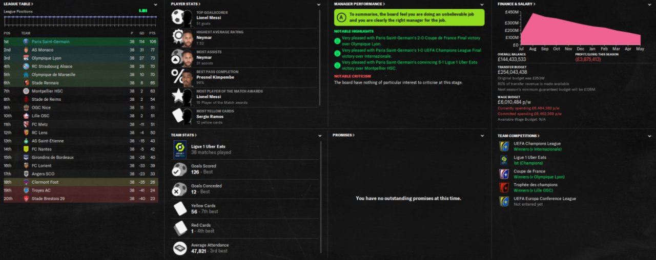 Dortmund Test completed. 91 points in the league. 11 points dropped. Ranked 1st for goals scored and conceded. Haaland 51 goals in all comps. Got the semi's of the UCL before being knocked out by A.Madrid. Defeated in the DFB-Pokal final and won the DFB-Supercup. So achieved a double, but didnt expect to get above 85 points in the league.