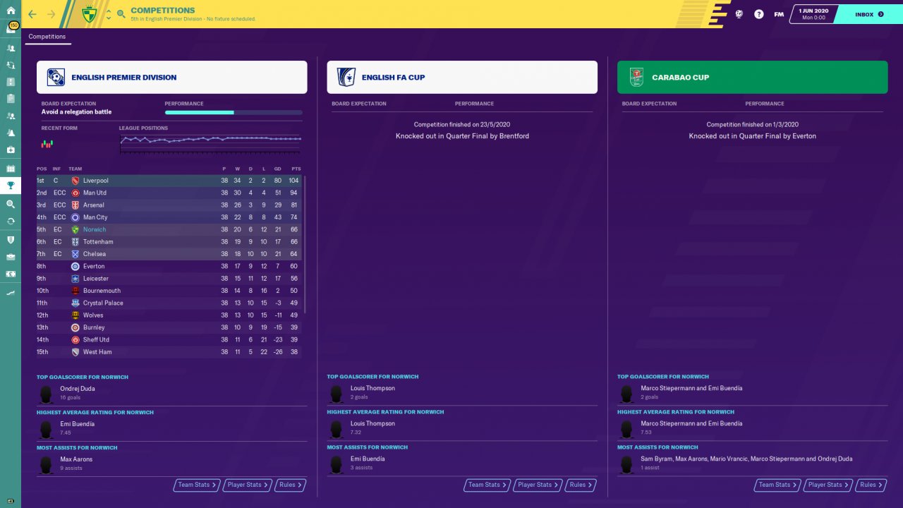 Hi there,I am sharing my second version of strikerless tactic. Below you will find results with Norwich team. I have not use FMRTE or In-Game Editor, just a holiday test. I am curious to see the results from FM-ARENA test.No OI, AM takes the training.