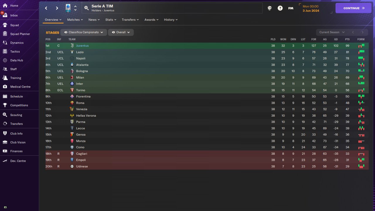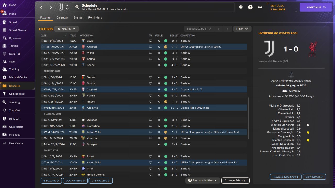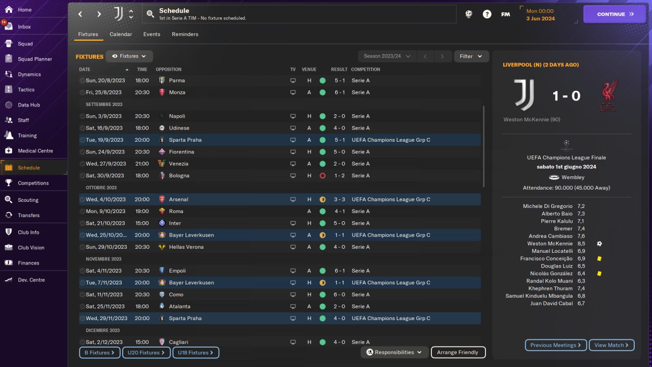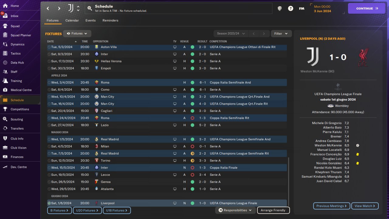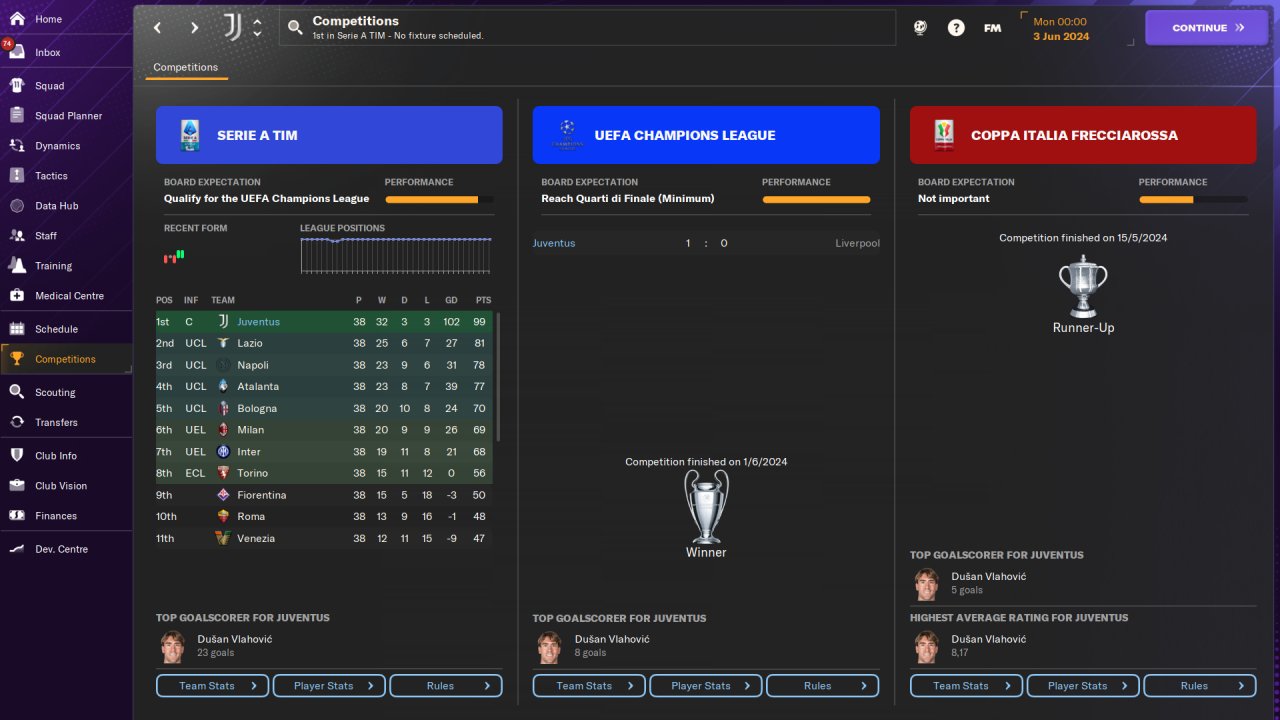 Played entirely on holiday mode, won the Serie A and Champions League with Juventus in the first season, no signings.
