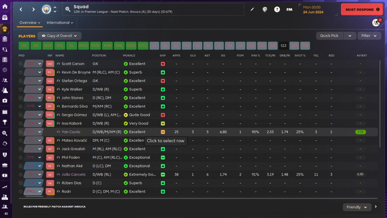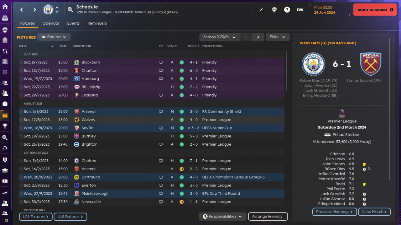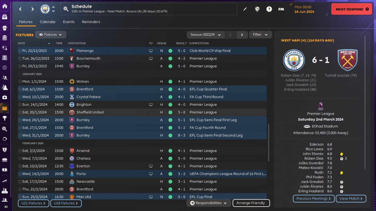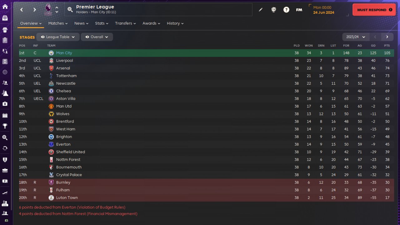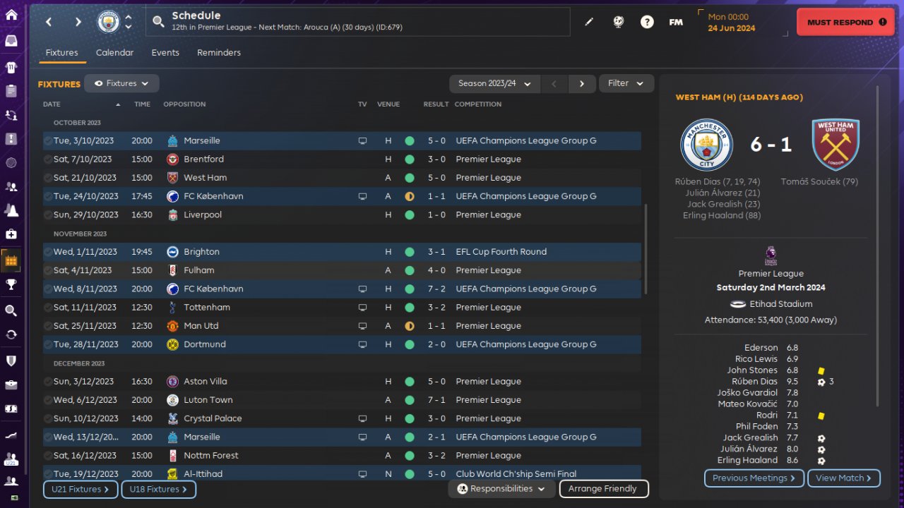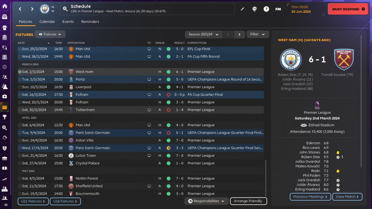 Delegated nearly every tasks, except set pieces and opposition instructions (I used https://www.fmscout.com/c-fm24-tactics.html?id=12102 for attacking corners, others just followed staff recommendations).