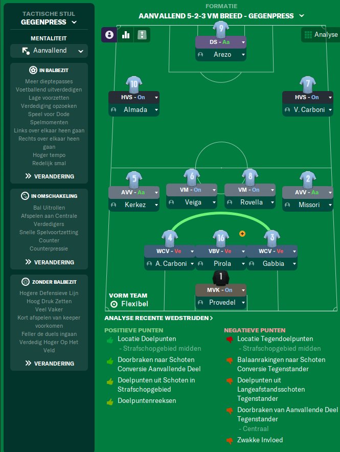 Tactical: A Lot of players begin in high position, but most of them are always behind the ball. Because of their starting position you will not concede a lot of goals. The team needs stamina and work rate to adjust to the mentality and pressure. It is even more effective against the stronger teams. They will not know what happens to them! Good luck!