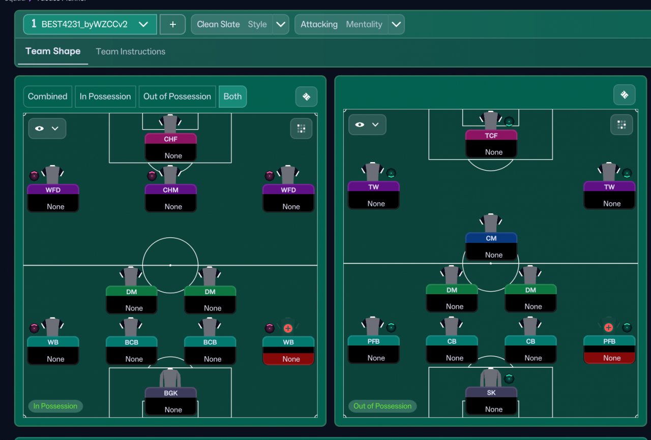 The core idea of this tactic is to activate the three attacking midfield positions (two wingers and the AMC) by having the central striker make some tactical sacrifices, allowing the inside channels (half-spaces) to become the main attacking zones. When both the inside forward and the mezzala (or attacking CM) are used together, the team’s offensive output becomes very dynamic.
