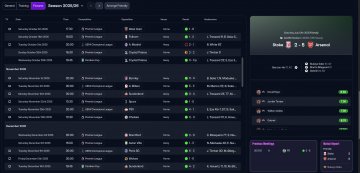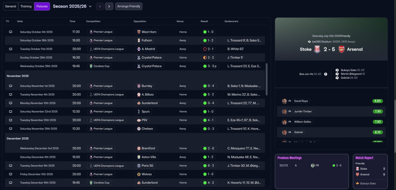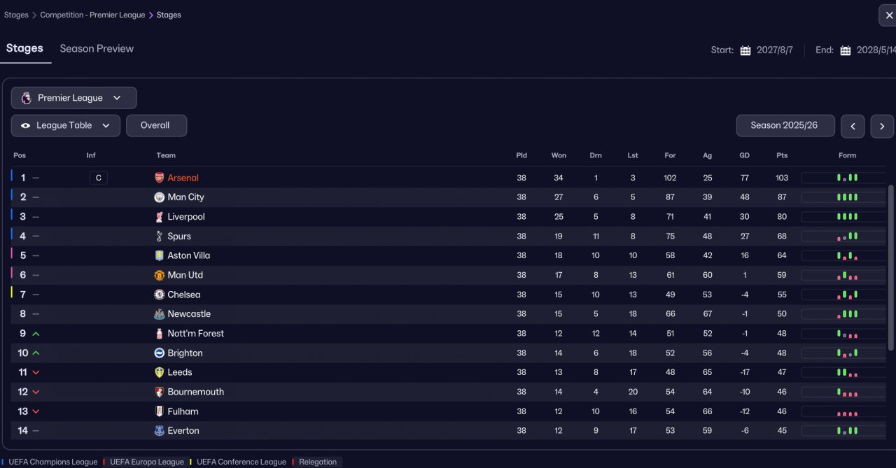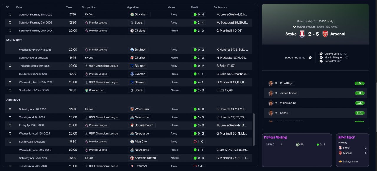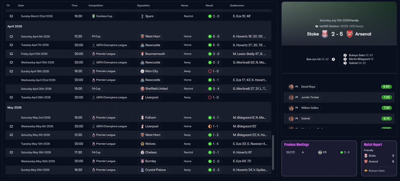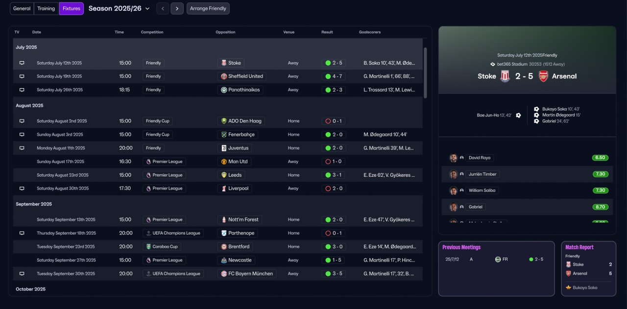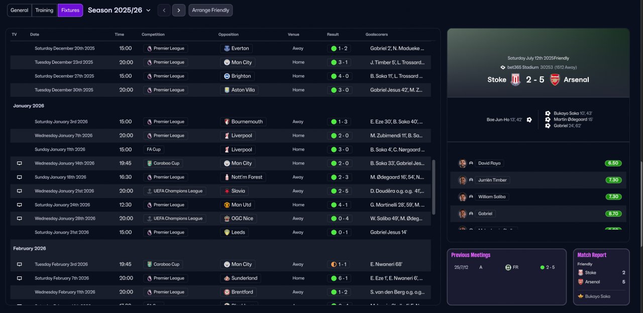 Unfortunately, I no longer have all the old save files, so I can only provide the Arsenal season screenshots. I also can’t find the detailed goal and assist distribution for the first season. However, from my observation, the scoring pattern was roughly: both wingers ≈ attacking midfielder > striker. I hope this information is detailed enough for evaluation.