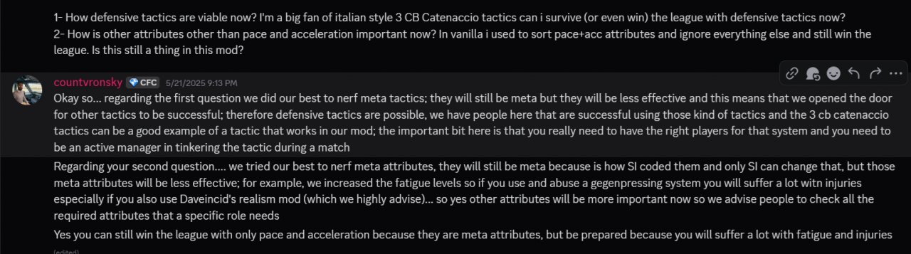 Now, the FM Match Lab team claims they’ve fixed this issue by increasing fatigue and injury risk in pace heavy tactics. However, they also admit that Pace and Acceleration are still hard coded METAs and can’t be changed. To me, that doesn’t really solve the core problem. Even if you increase injury risk, a player with high pace/acceleration or strong physical stats can still perform marking, tackling, and passing actions effectively, regardless of their actual attributes (even when using a low-block tactic).
