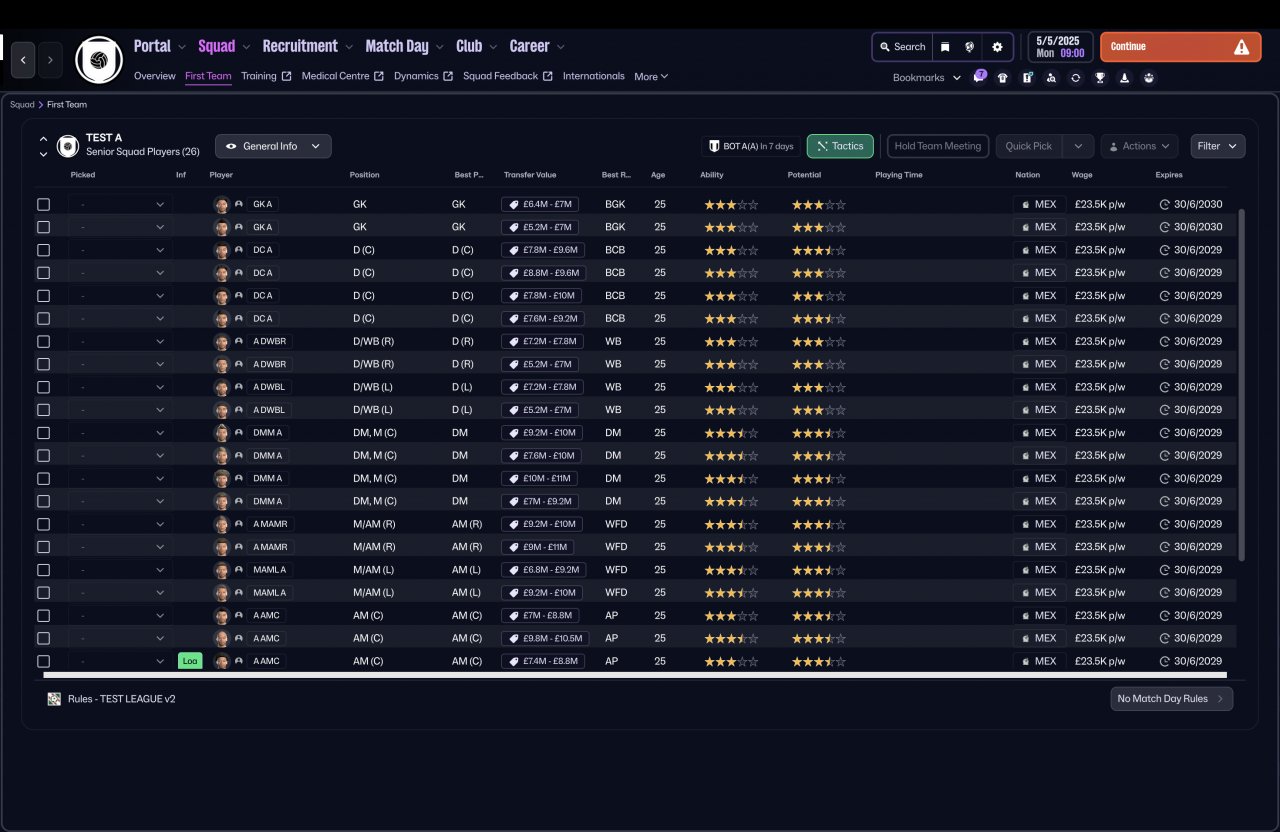 - Specialized Players: All teams have identical squads with custom-built players (CA ~125) for specific roles (e.g., a set-piece AMC, a poacher ST, MAML, MAMR, DMMC, etc.).