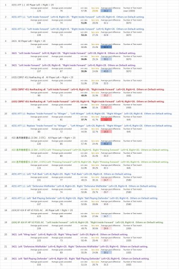 In 20 is to reverse the feet of "WBL- "Wing-back" and" WBR- "Wing-back" The performance dropped significantly, from 39.1 to 29.7. Conclusion: In this tactic, WBL and WBR strongly need to use the main feet in the same position