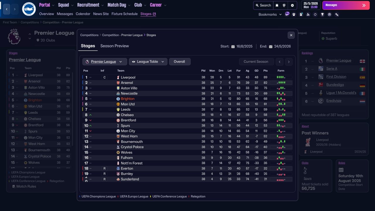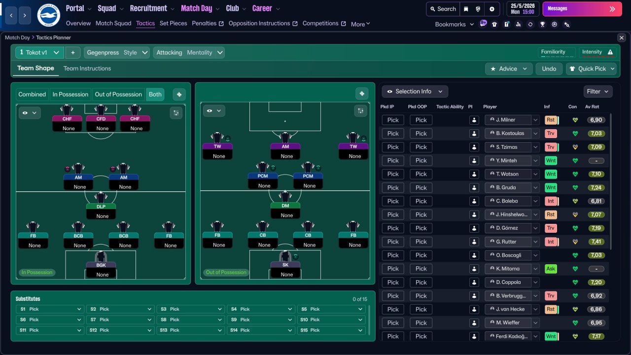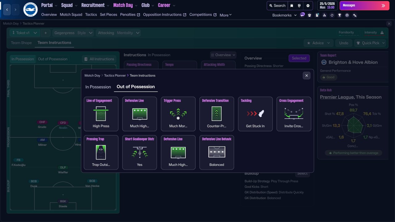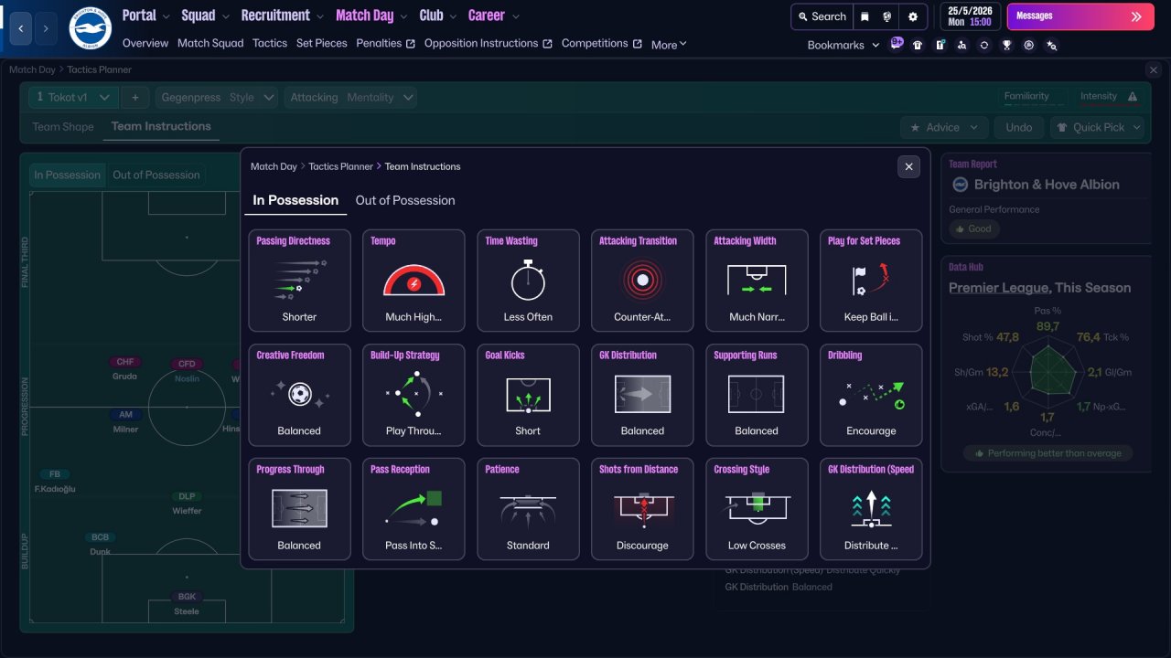 Here i provide some Brighton screenshots. Honestly, the team isn't really suited for three strikers, Mitoma and Minteh were unused, but still got respectable results. In defence there is a work to do, i tried with lower defensive line but the results wasn't great. I will be working on it in the future for sure.