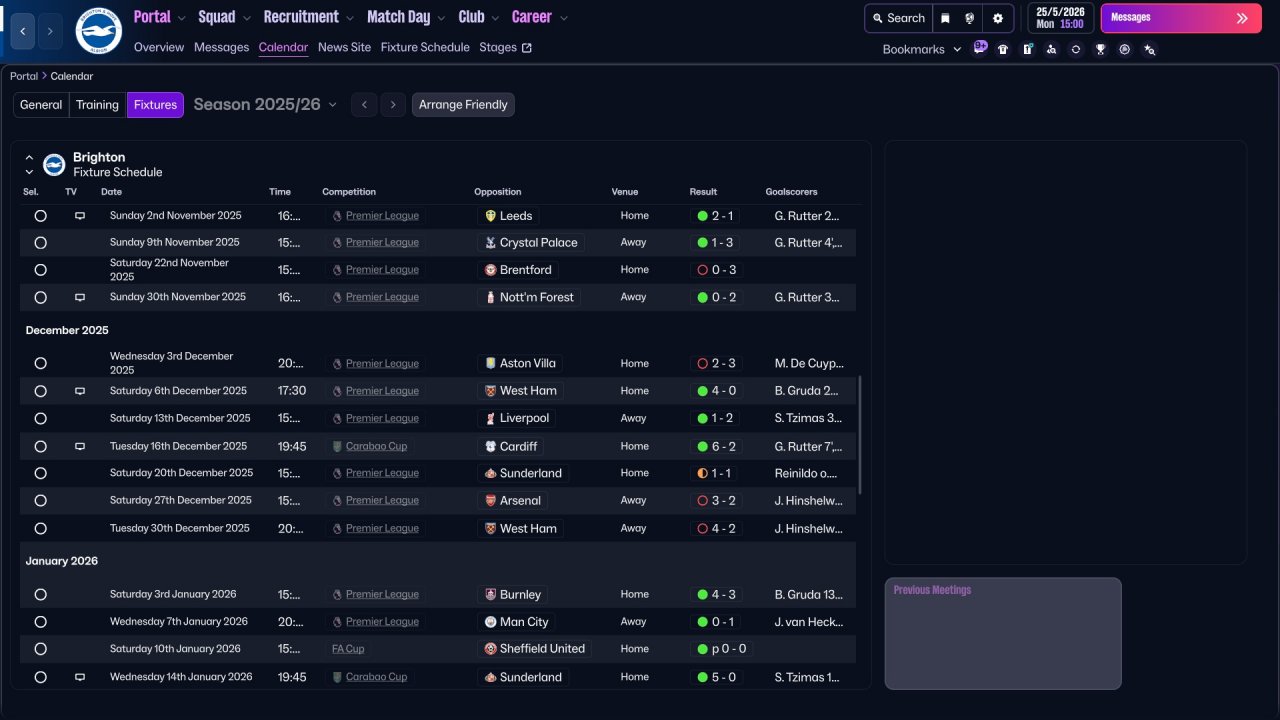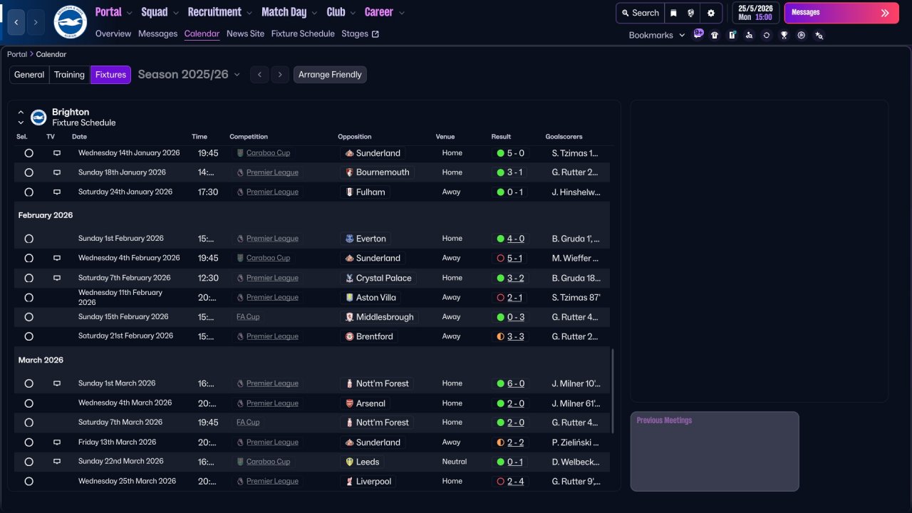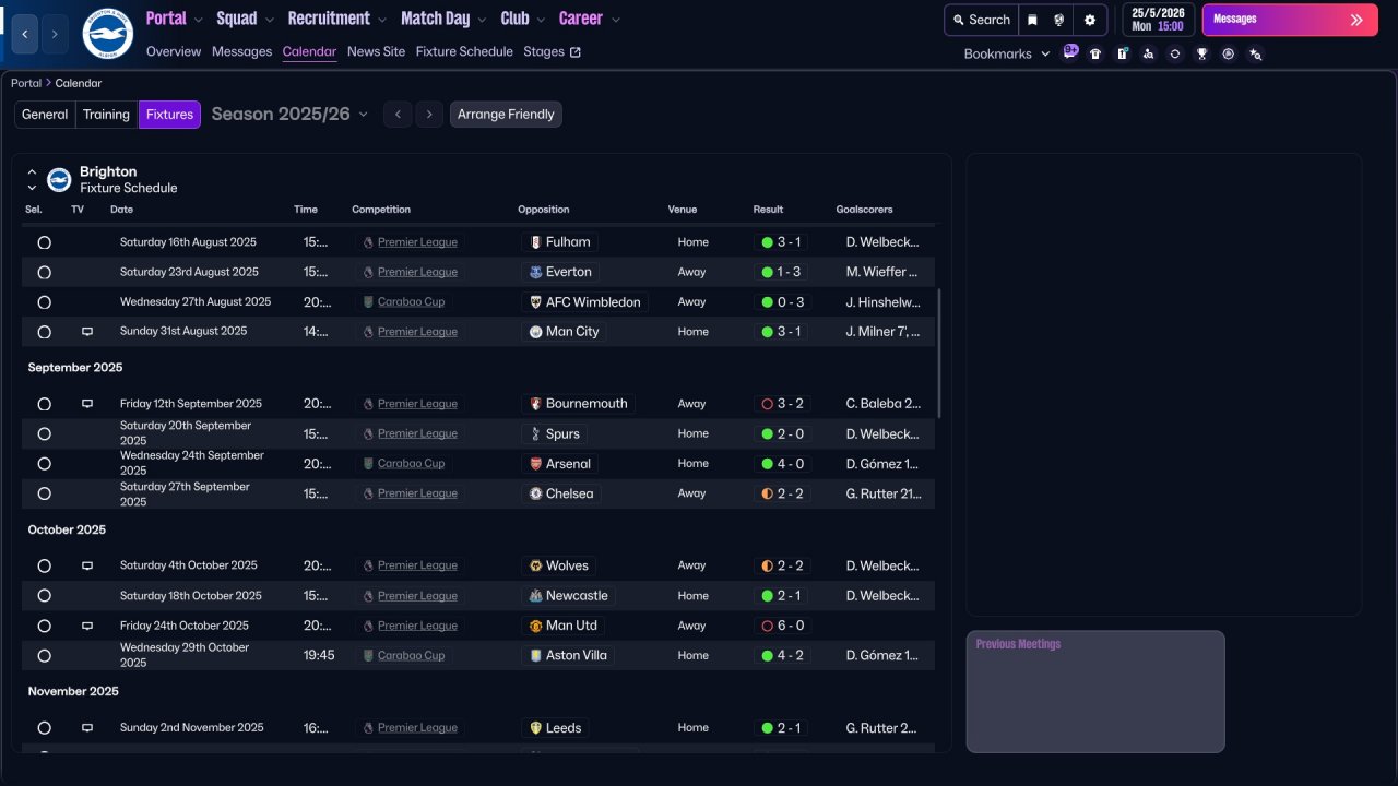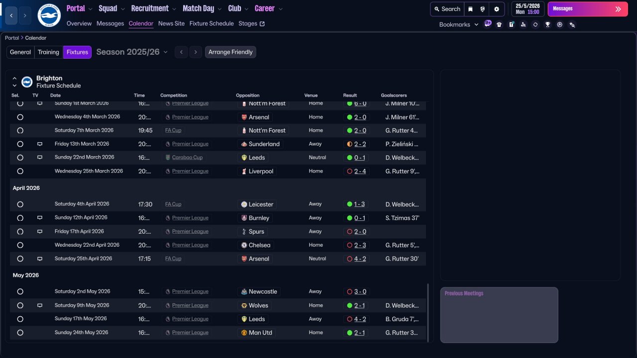 Here i provide some Brighton screenshots. Honestly, the team isn't really suited for three strikers, Mitoma and Minteh were unused, but still got respectable results. In defence there is a work to do, i tried with lower defensive line but the results wasn't great. I will be working on it in the future for sure.
