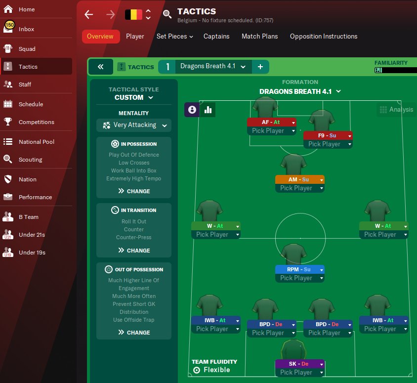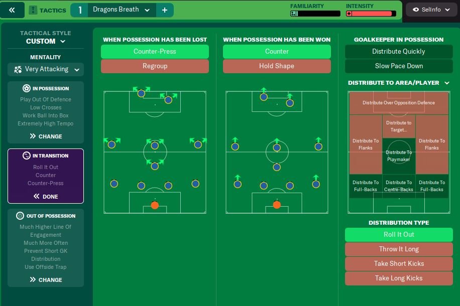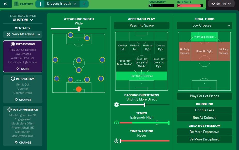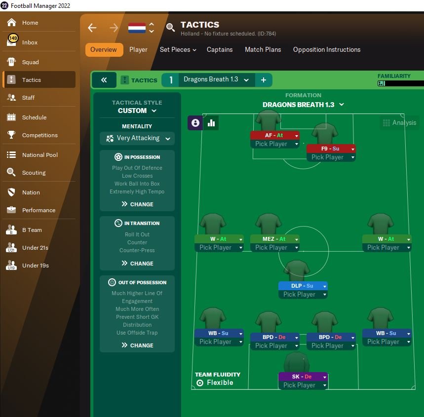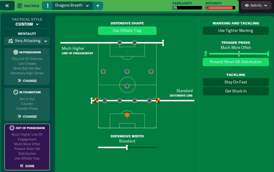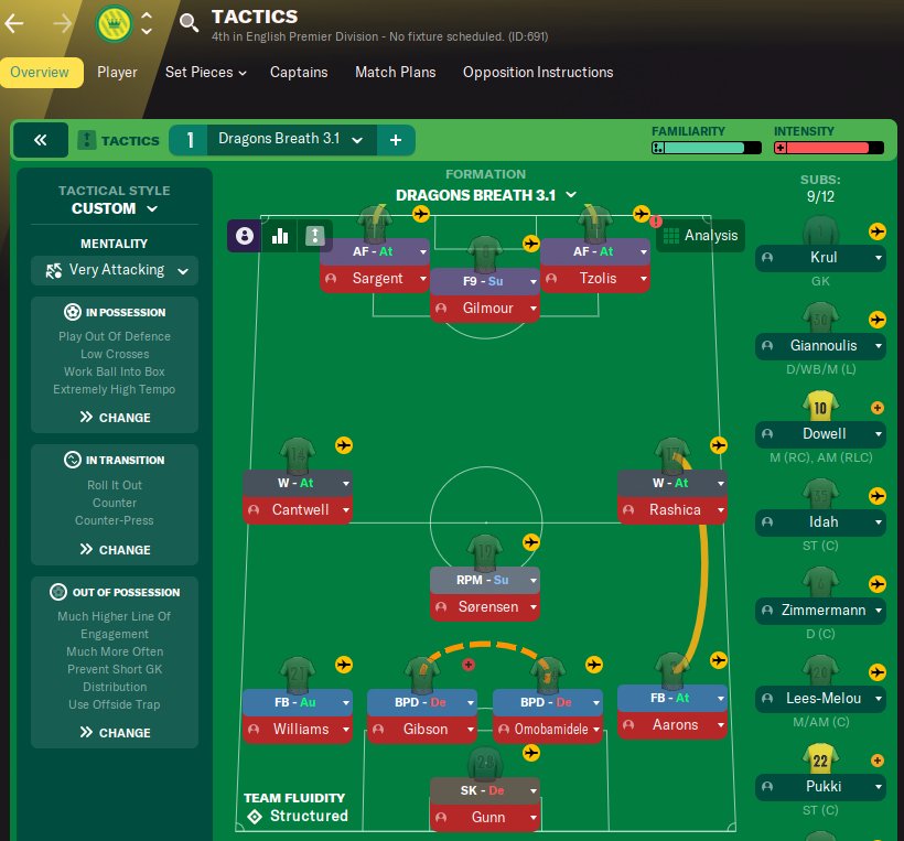 I have added a new version of this tactic which is over the top attacking. Dragon Breath 3.1. Moved the F9 across to AF and brought the CM Attack up to F9. This has given a ridiculous amount of scoring. Even got Norwich to 4th at the end of the season in EPL.