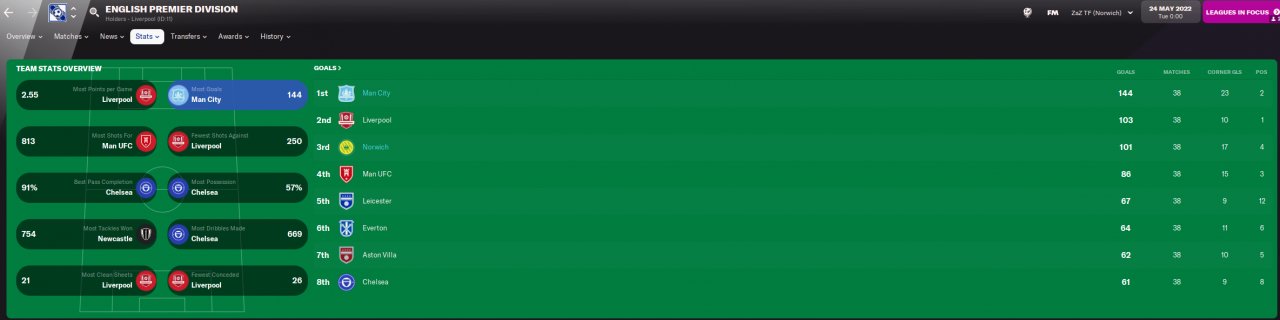 Man City with 144 goals and Norwich with over 100 goals in the season. Corner routine worked pretty well with City getting 23 and Norwich 17 from corners.