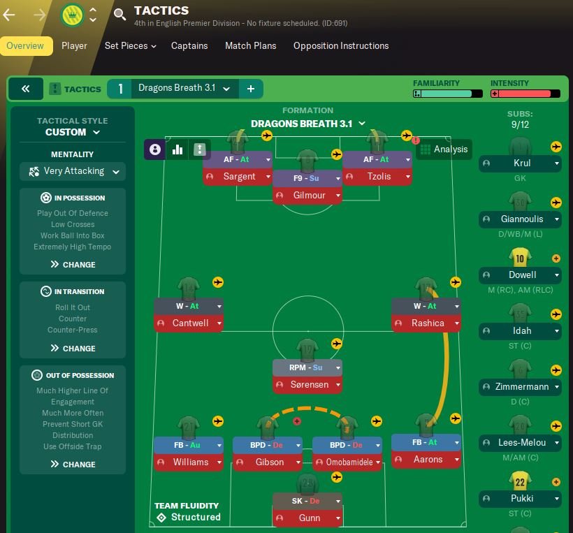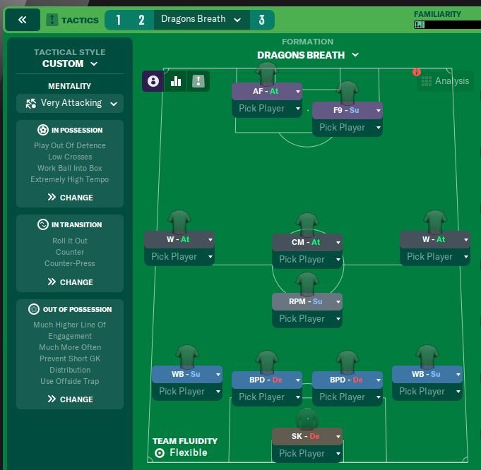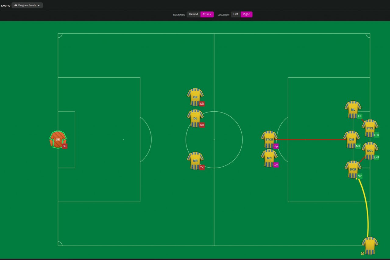 From Dragons Breath the CM Attack moves forward to a AM Support. Changed the full backs to IWB Attack. Changed the set pieces again.
