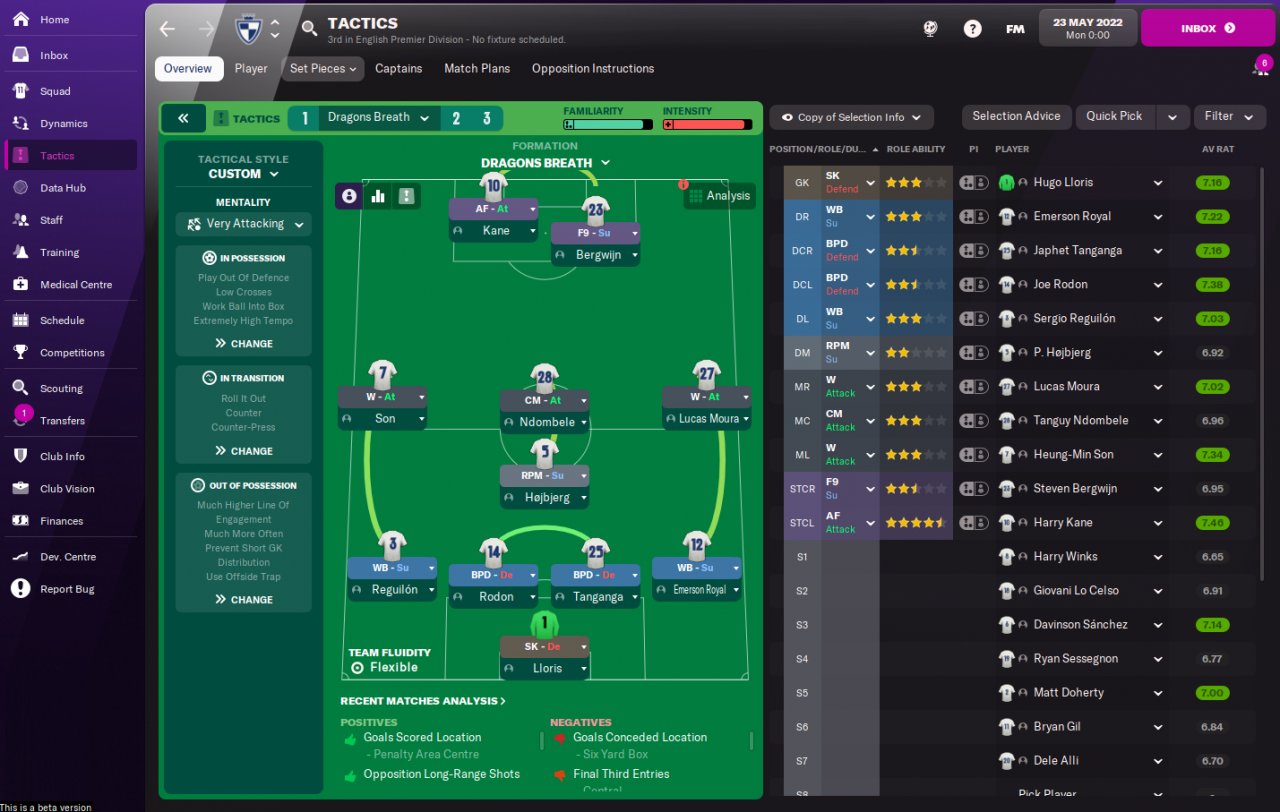 I have tweaked this tactic to be very aggressive in attack to try and match what the match engine favors. The CM has moved forward to an F9 position and the old F9 has moved across to AF on the right. The old WBs are now FB Attack. I have removed all the tackle harder PIs and reworked all the set pieces.