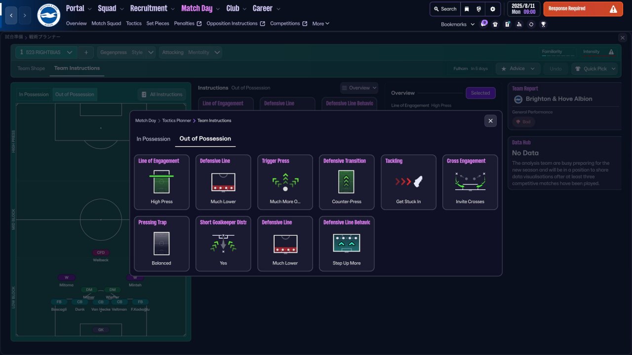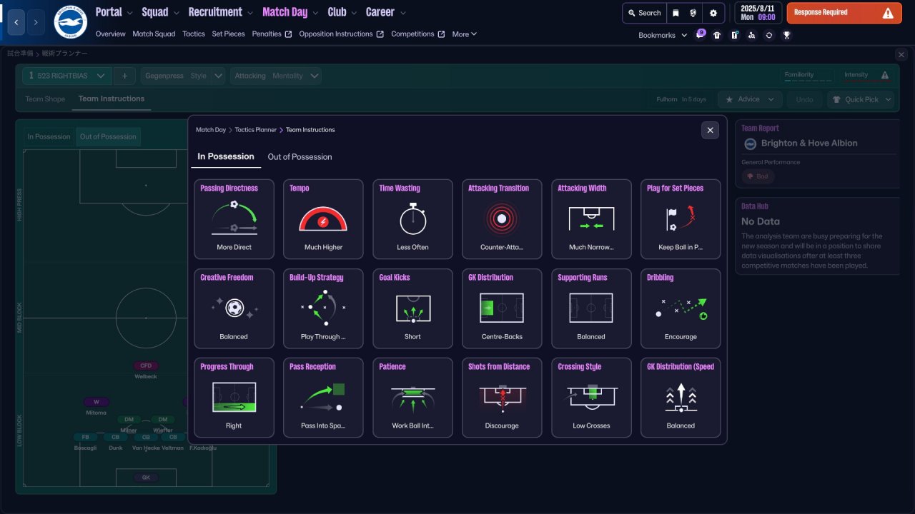 Inspired by the tactics in https://fm-arena.com/thread/16202-argus-23-3421-p98-ac/ and https://fm-arena.com/thread/16150-343-invertide-v1-5/, I designed this setup to utilize a Playmaking Wing-back at left back.