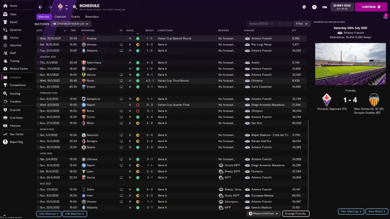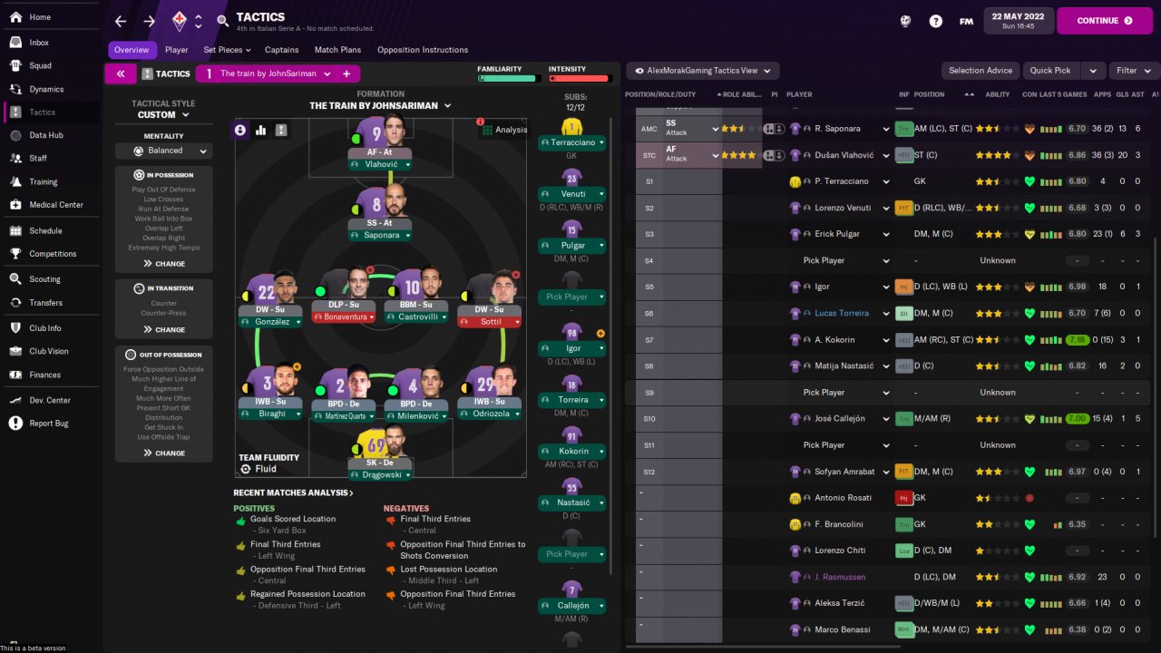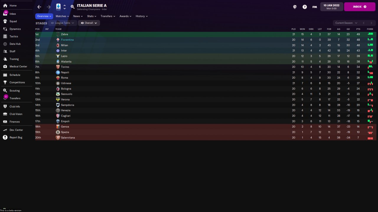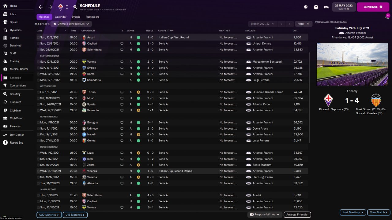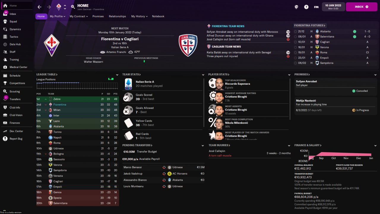 here you see the best tactic for the beta! we started so well but in the end of the seasson team was tired.If you have a strongly forward like Vlahovic and speedy BPD you will score a lot and defence will be better. I decided to play with balance mentality but positive also going well. DW also worked very very good.This save with Fiorentina IS WITHOUT ANY TRANSFERS!!!Waitting your opinions!