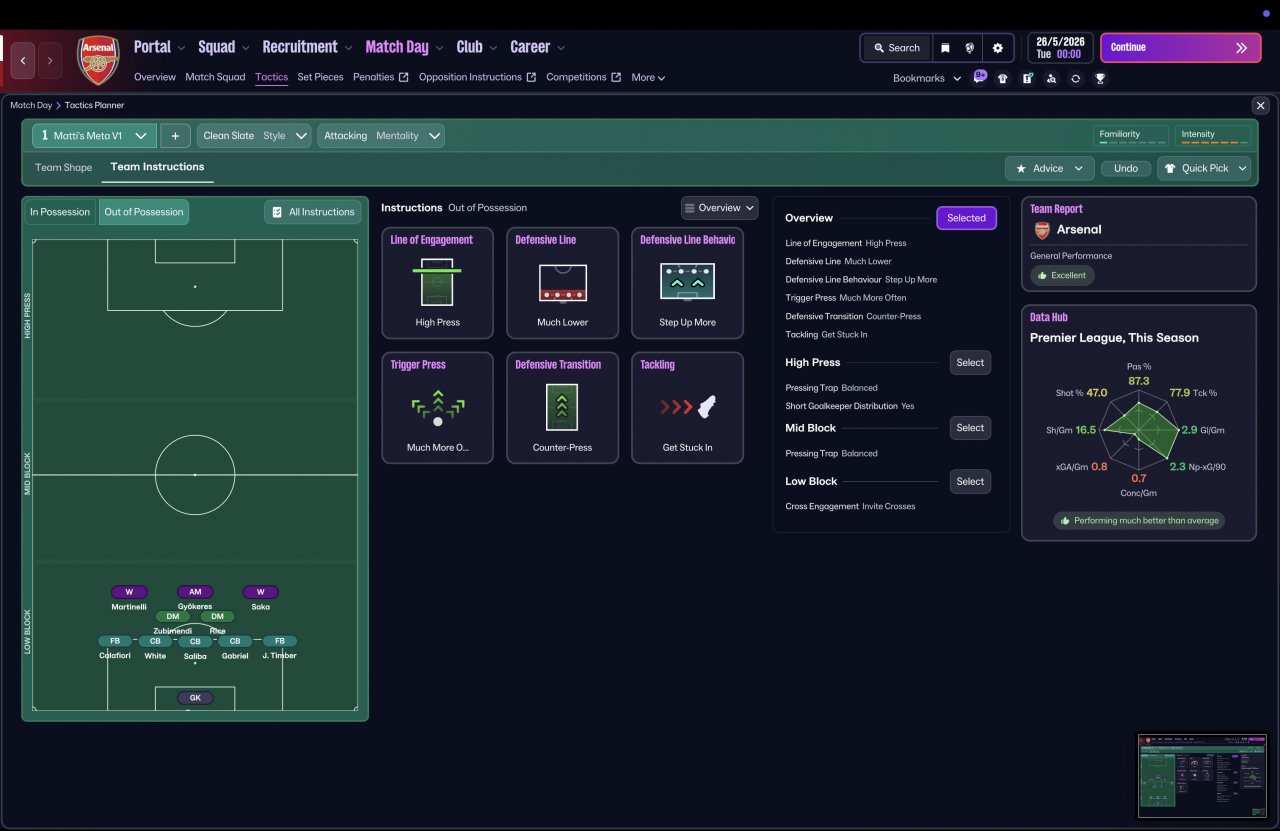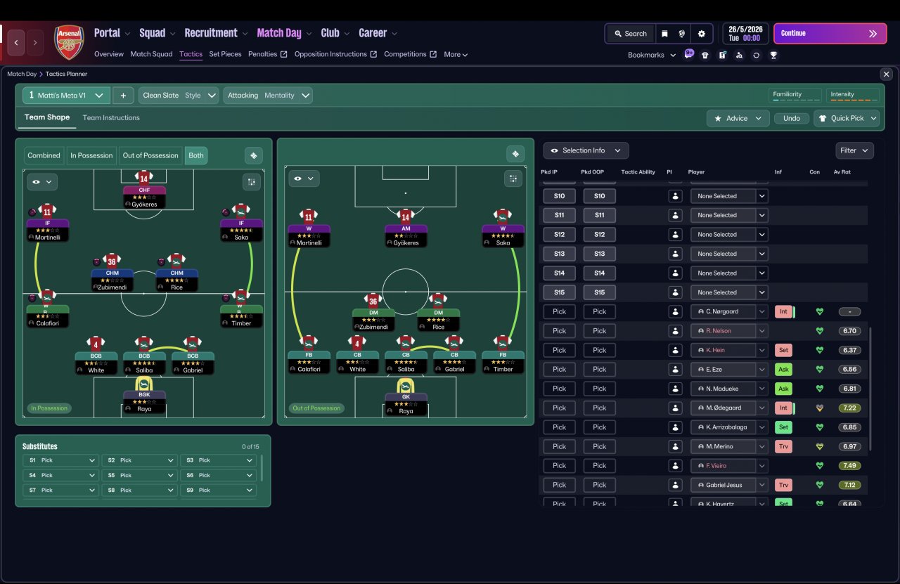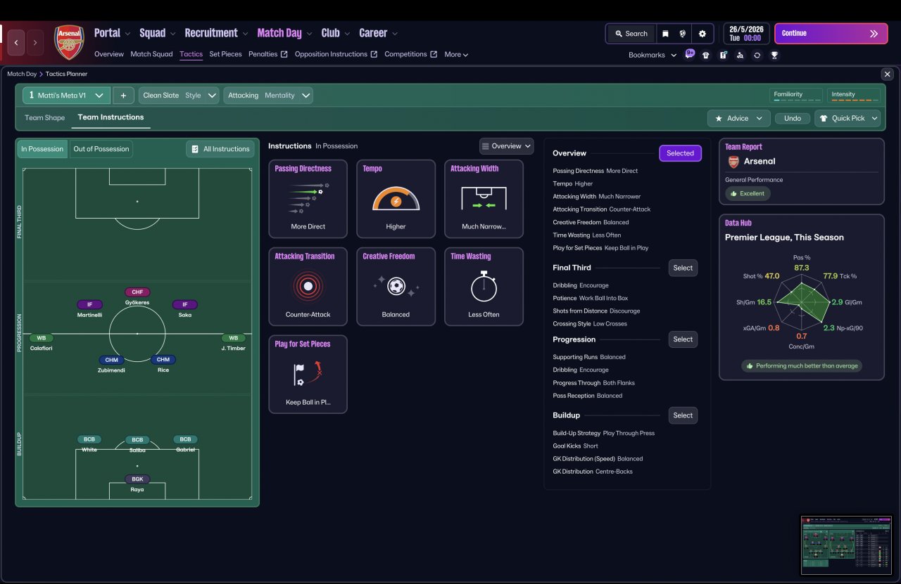 I looked at the top 20 highest-rated tactics tested for FM26 and stripped them back to the fundamentals — identifying the most common positions, roles, and team instructions that kept appearing again and again. The aim was simple: could the “meta” pieces actually function together as one coherent system?