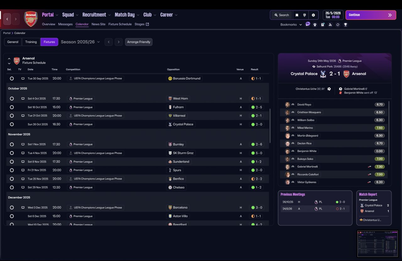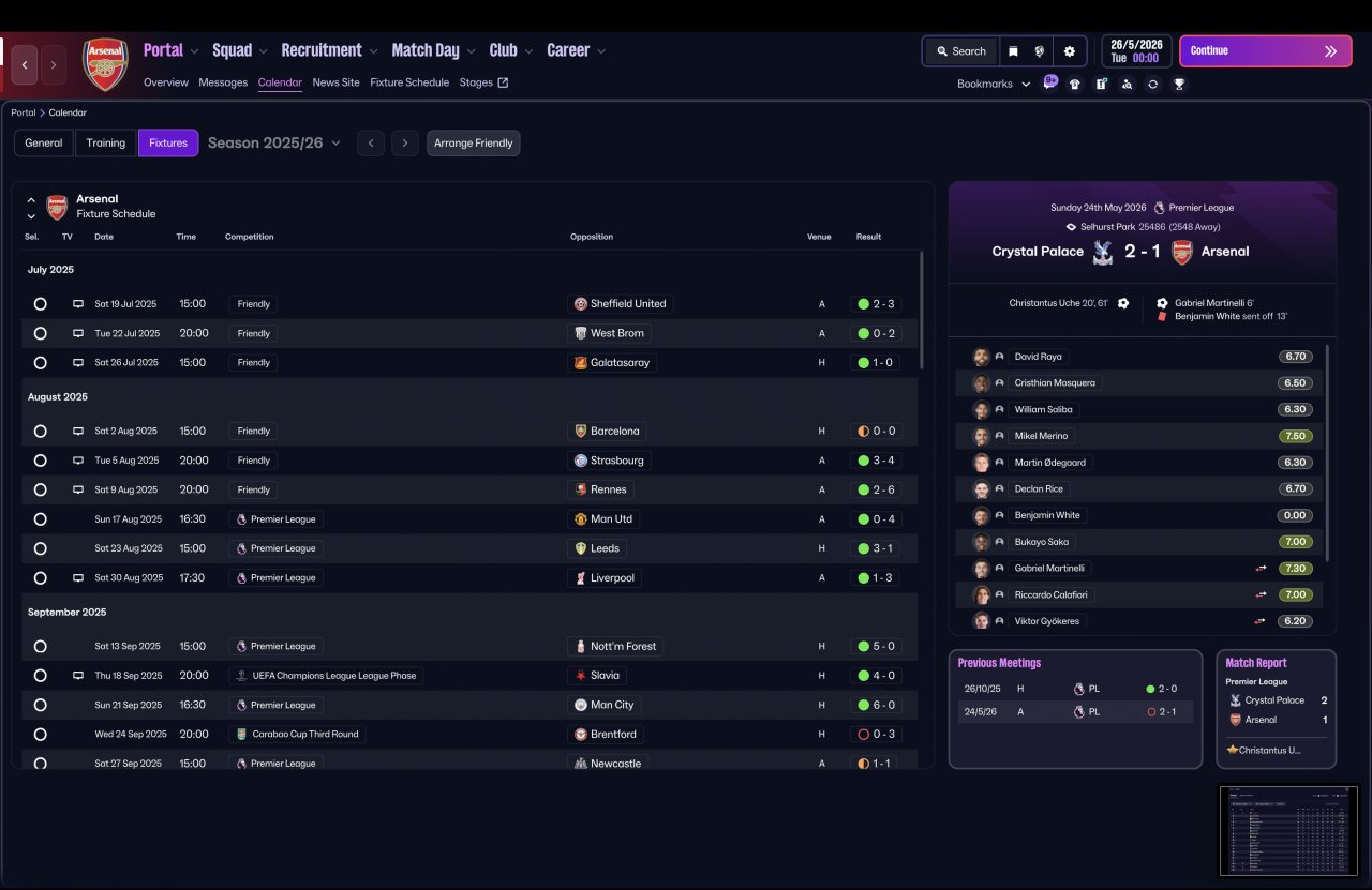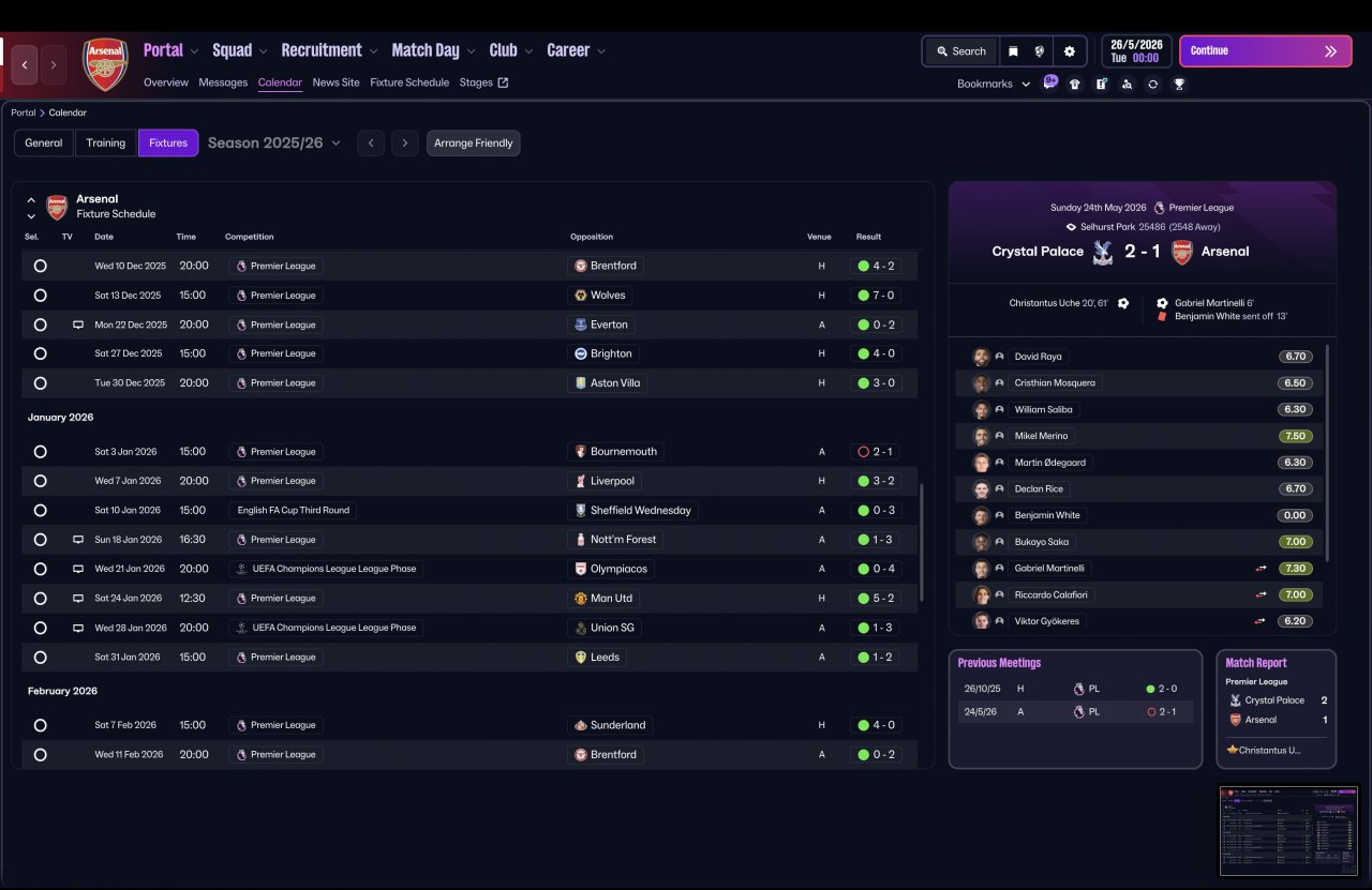 Tested again using a completely vanilla Arsenal squad, the system delivered elite-level consistency across competitions — dominant in the league, defensively solid, and still ruthless in attack.