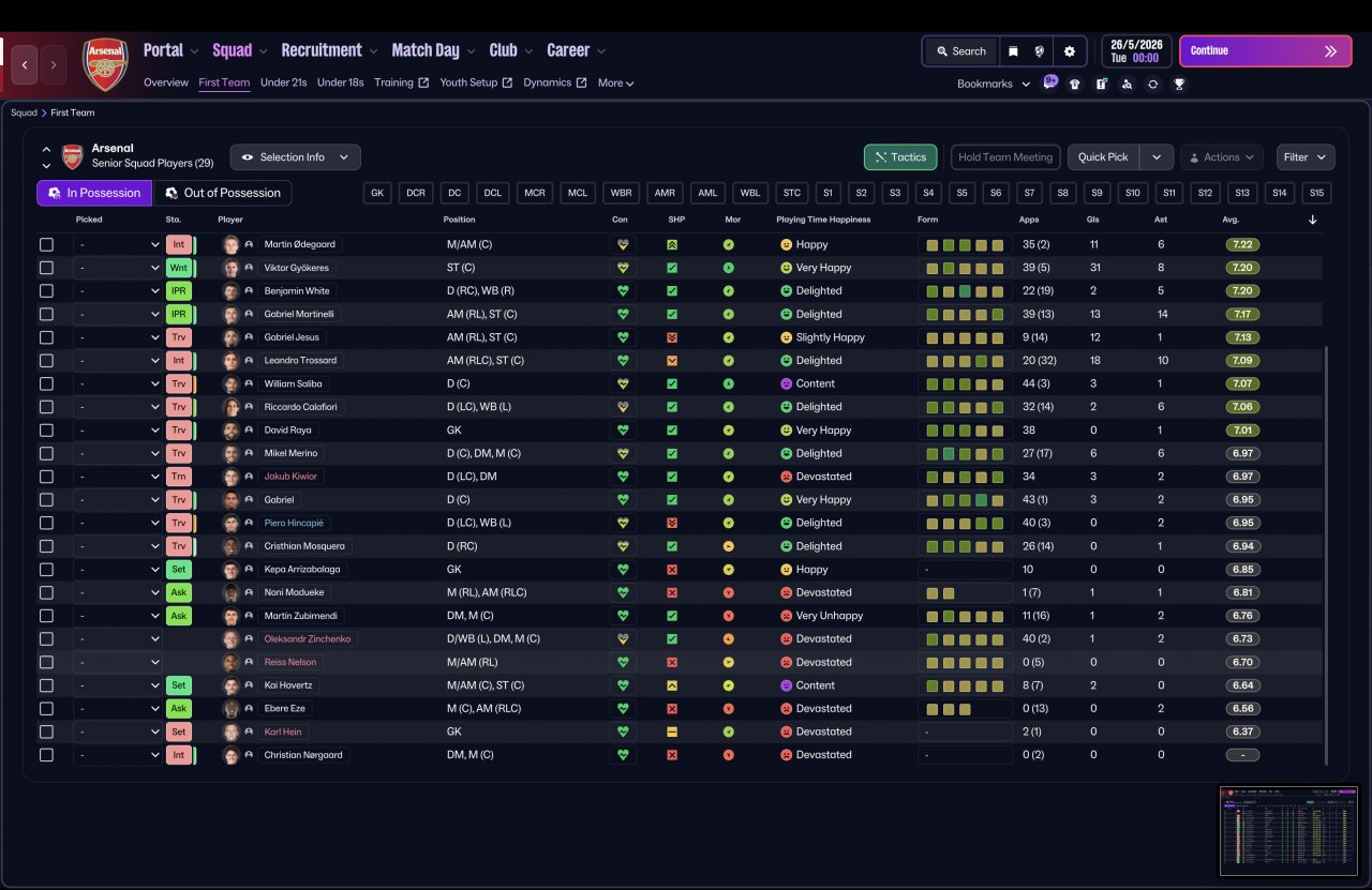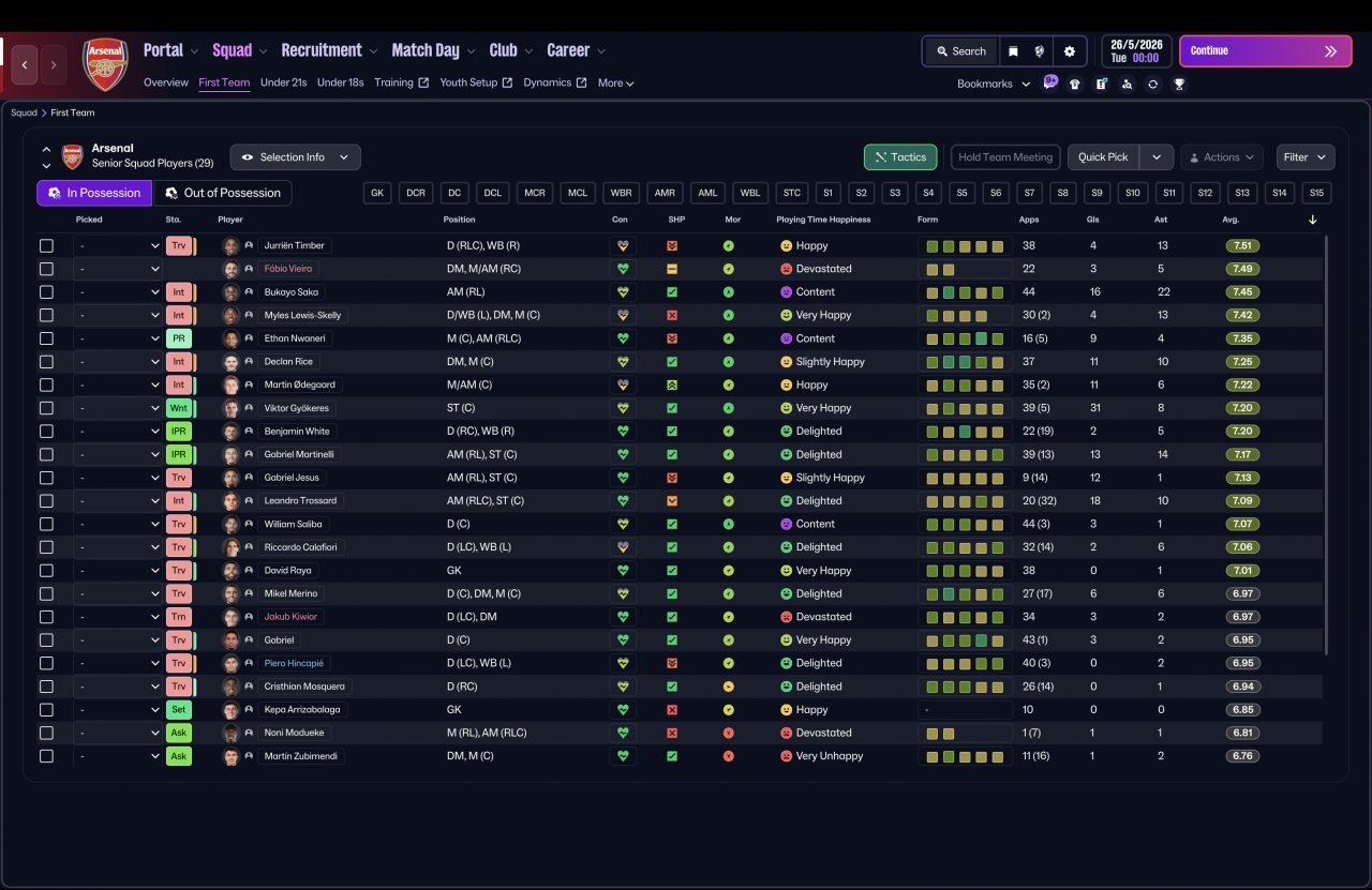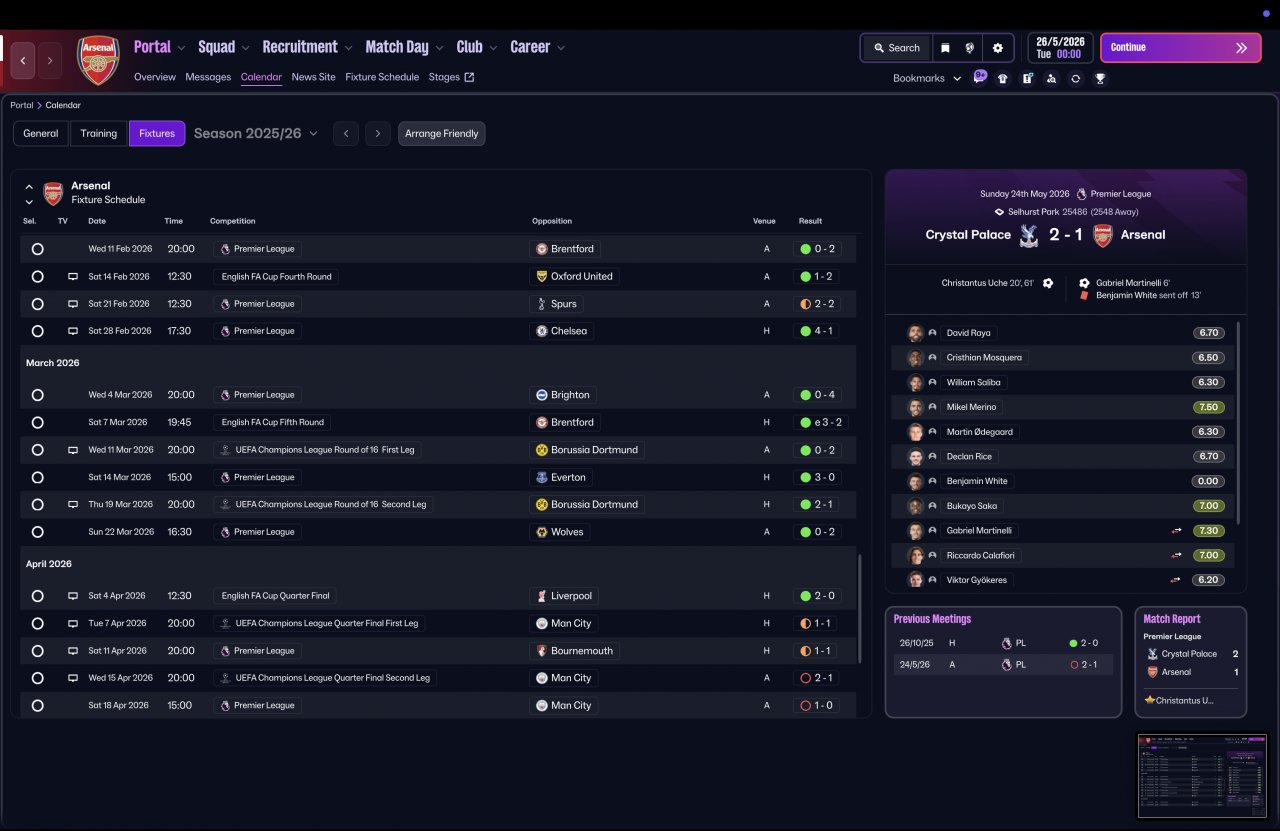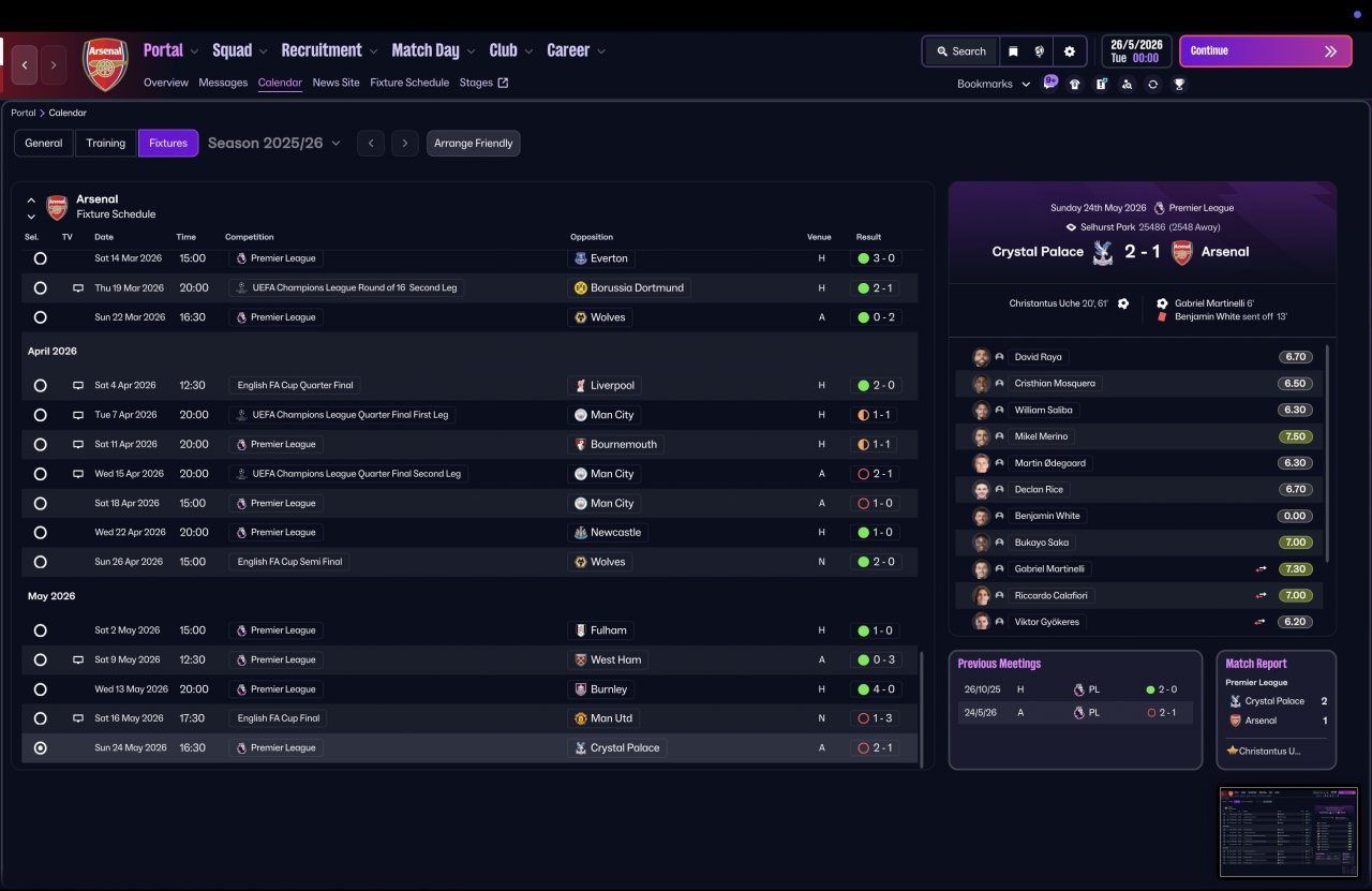 Tested again using a completely vanilla Arsenal squad, the system delivered elite-level consistency across competitions — dominant in the league, defensively solid, and still ruthless in attack.