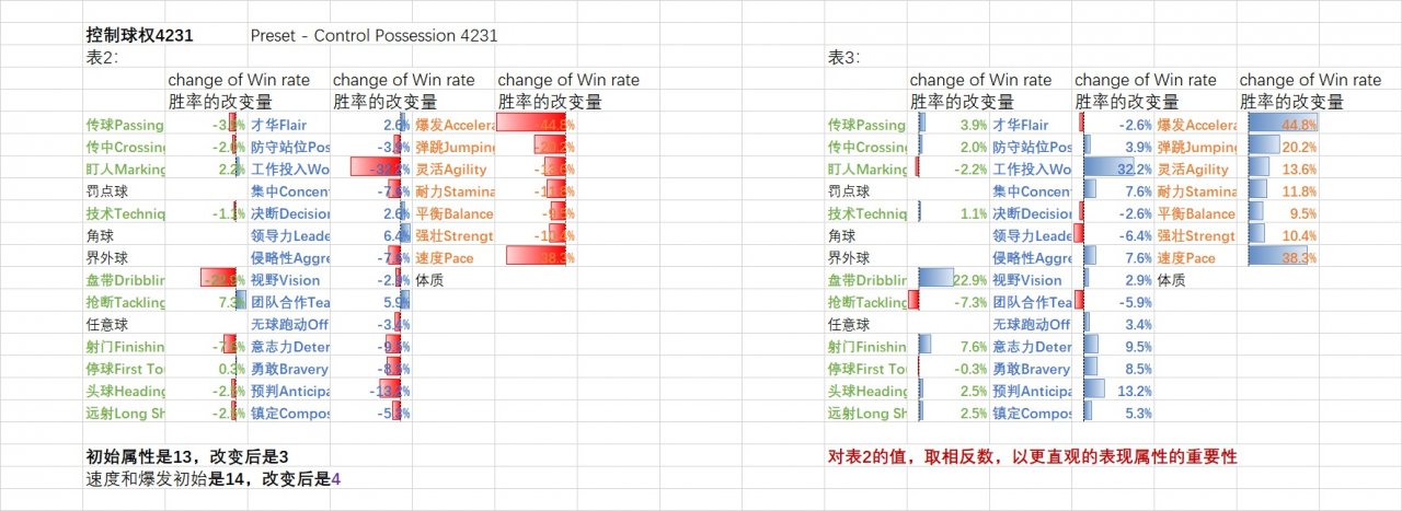 2.non Gegenpress , Preset - Control Possession 4231 In the test The initial value of all attributes is 13