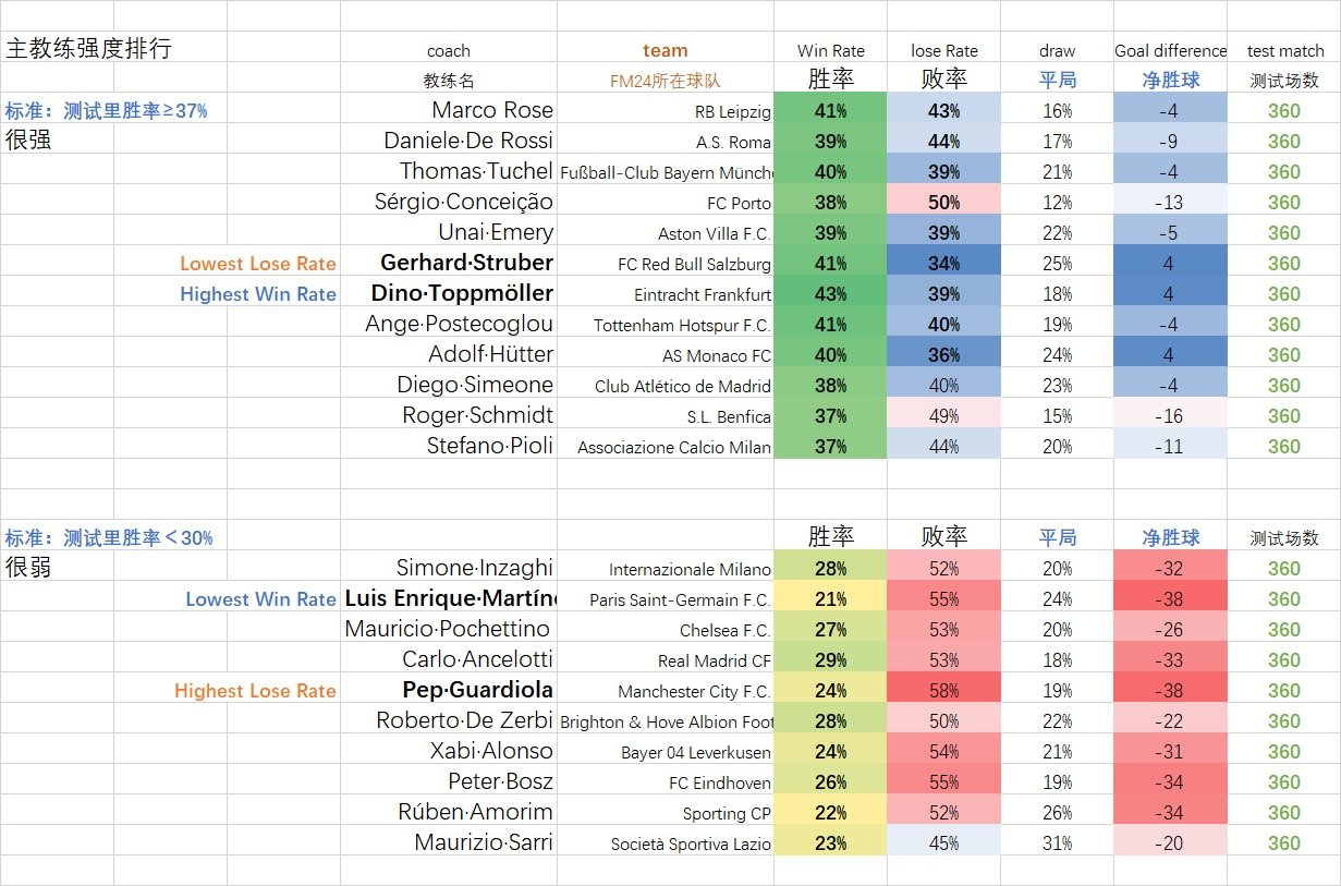 This time, only one tactic was used to measure the result, which may not fully reflect the intensity, but it can be roughly referred to Note: The "strength" of the coach (whether it is good for the game engine) has nothing to do with the "strength" of the players at all. Strong players can also be paired with weak coaches
