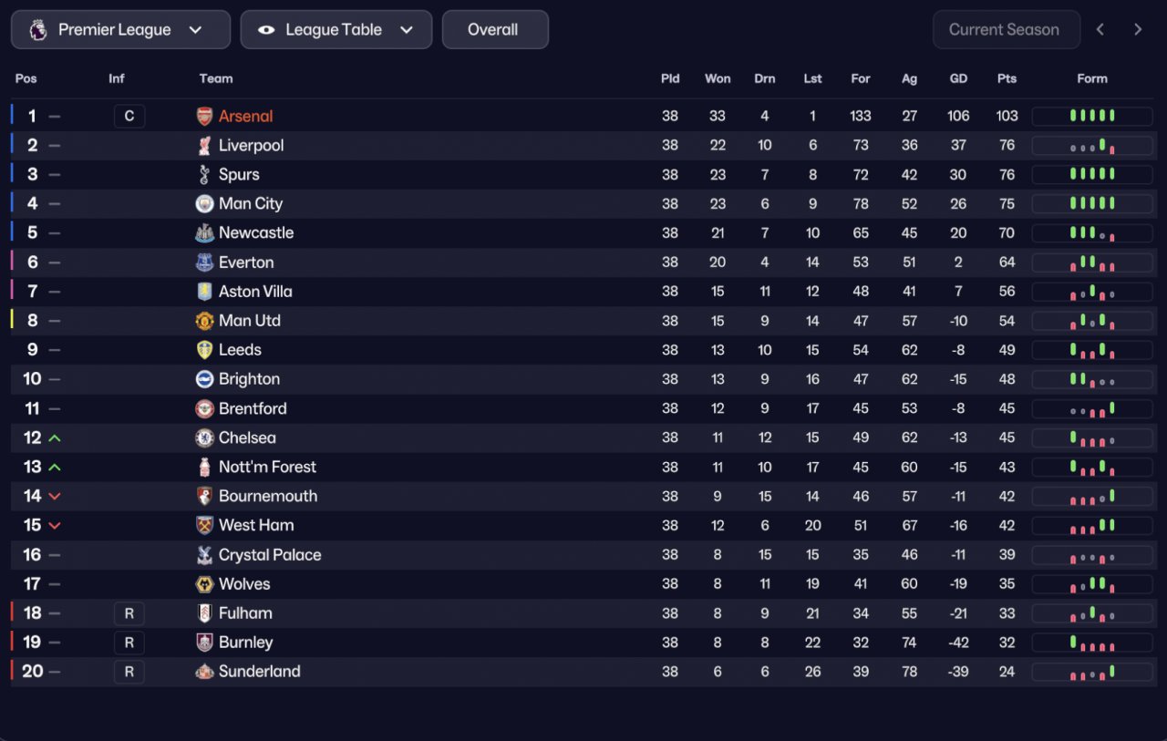 League Points and Goals: 106 points, 133 scored / 27 conceded