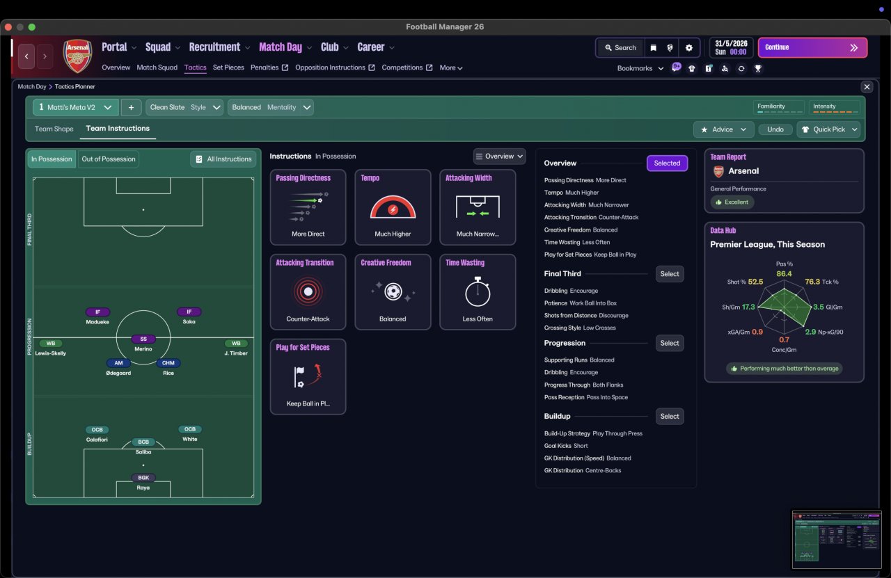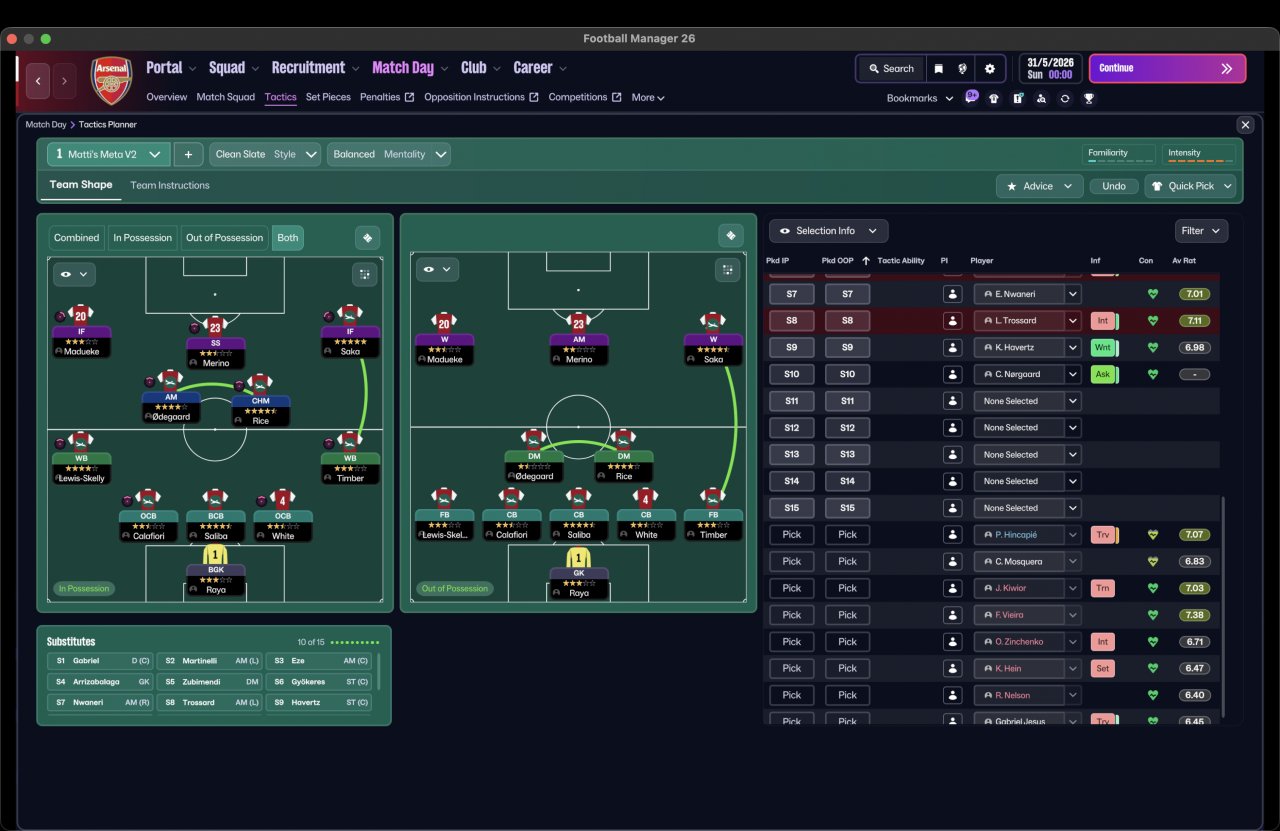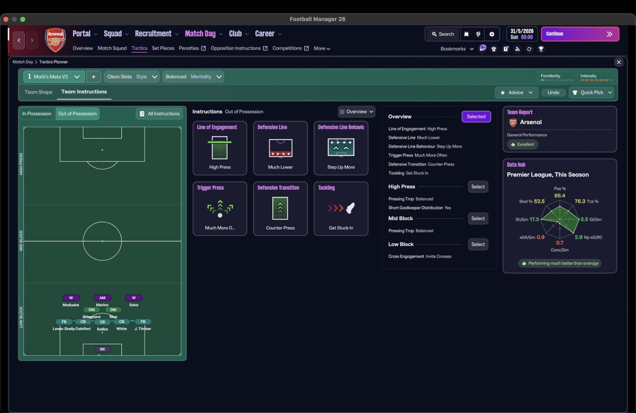 Unlike V1, there are no concessions for longevity, realism, or season management. This setup is built purely from the top 25 current FM26 tactics, averaging out the most common positions, roles, and team instructions, and running them together exactly as the data presents them.