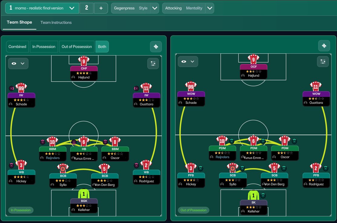No Opposition Instructions are applied to avoid unnecessary disruptions to the shape. The tactic naturally adapts to the match context, but manual tweaks can always be made depending on the opponent.