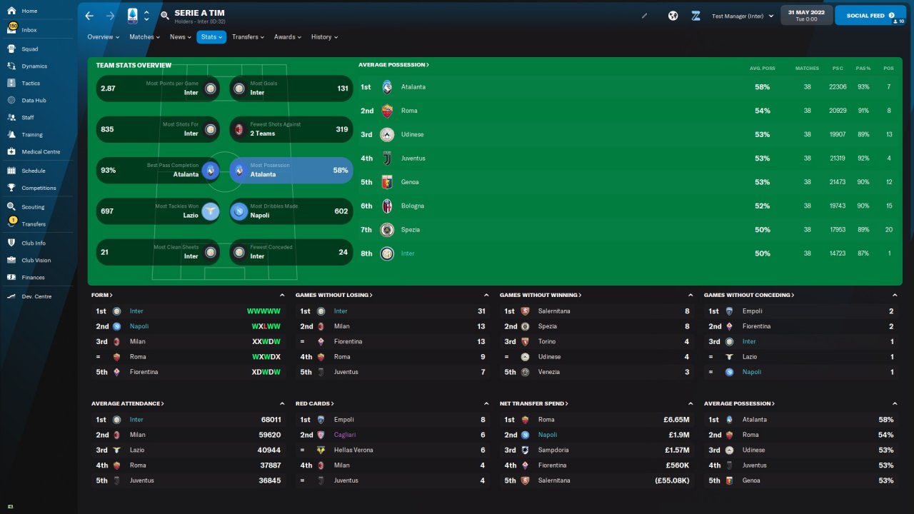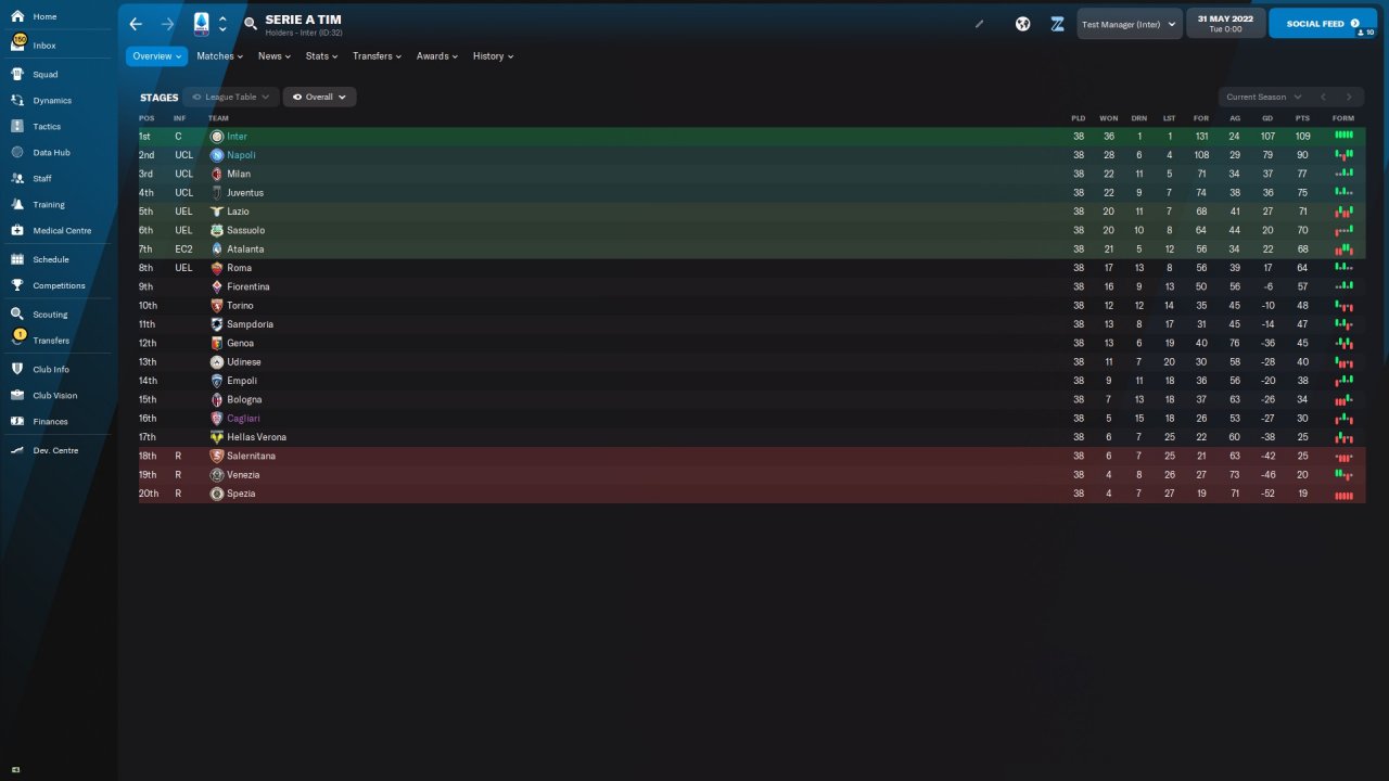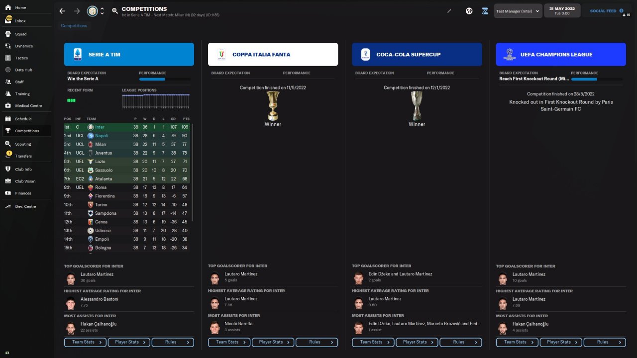 Inter Milan dominated what is nowadays an open Serie A only dropping 5 points all season and having a great goal differance finishing top scorers and best defence which is a great achievement. Napoli also came in 2nd place with over 100 goals scored again.