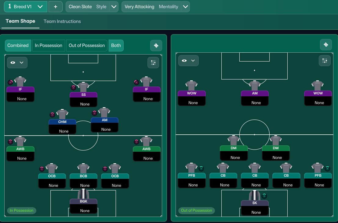 Inspired by ZaZ 1.55 Autumn VA, changed midfield to 1 CHM and 1 AM from 2 CHM with Make More Runs on both. OOP made GK -> SK and FB -> PFB. Wingers into WOW. Instructions remain the same. Aiming for goals.