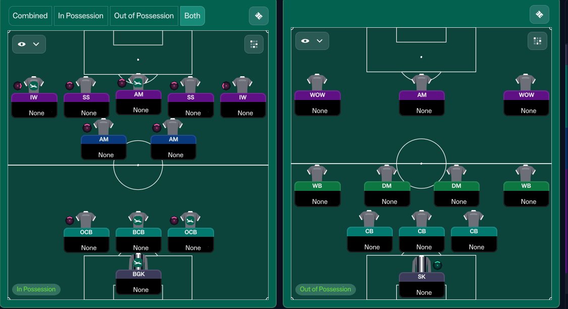 Inspired heavily by grindo26 3-2-5 Tactics. Changed CHM to AM, WDM to DM, GK to SK. and W to WOW. Added distribute quickly. Make more runs on the midfield AMs. Dribble more on the OCBS, mark tighter on the DMs and removed marking for the WOW, added take more risks to the AM. Aiming for goals again.