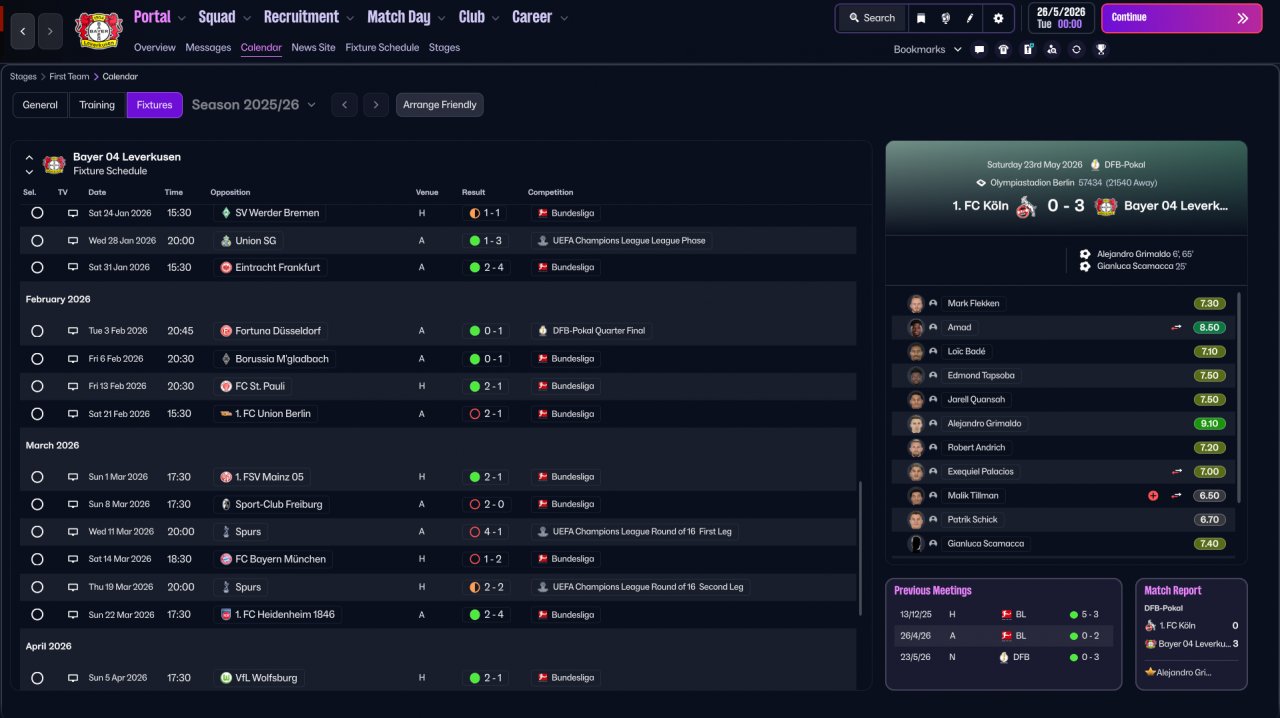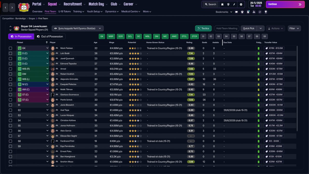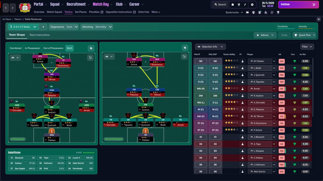 I tried this tactic and played one season with Leverkusen. I bought Amad from United. In this tactic, the wing-back is the most important role and must have high pace and good technique. I finished 2nd in the Bundesliga. Since the season was only simulated, the results would be even better with real gameplay. However, for this tactic to work properly, the team needs to be dynamic and your rotation players also need to be suitable for the tactic.