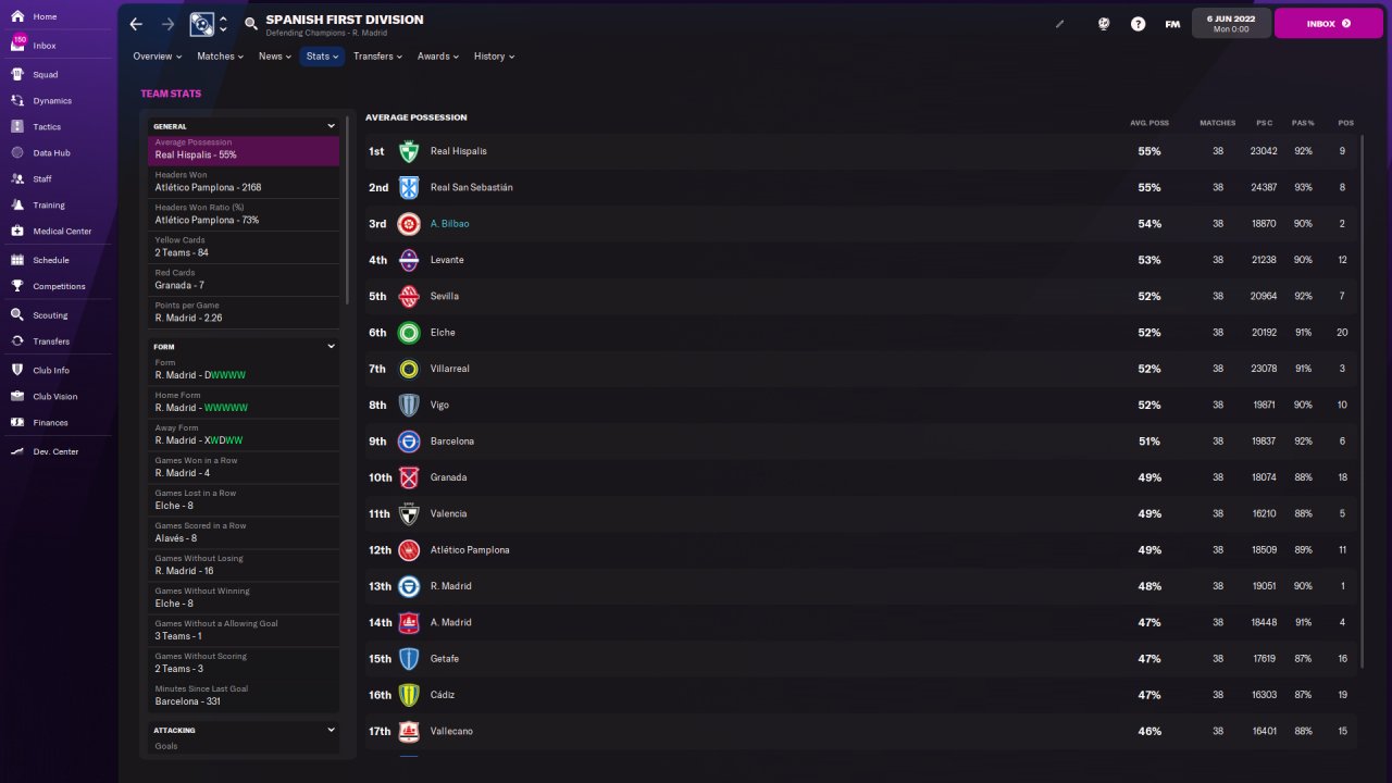 54% possession, 3rd in the league. The 4 offensive players run the show scoring most of the goals. A decent 6 goals for each central defender as part of the set pieces.