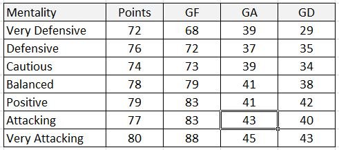 So far tested have been Very Defensive (72 pts), Defensive (76 pts), Cautious (74 pts), Balanced (78 pts), Attacking (77 pts) and Very Attacking (80 pts).