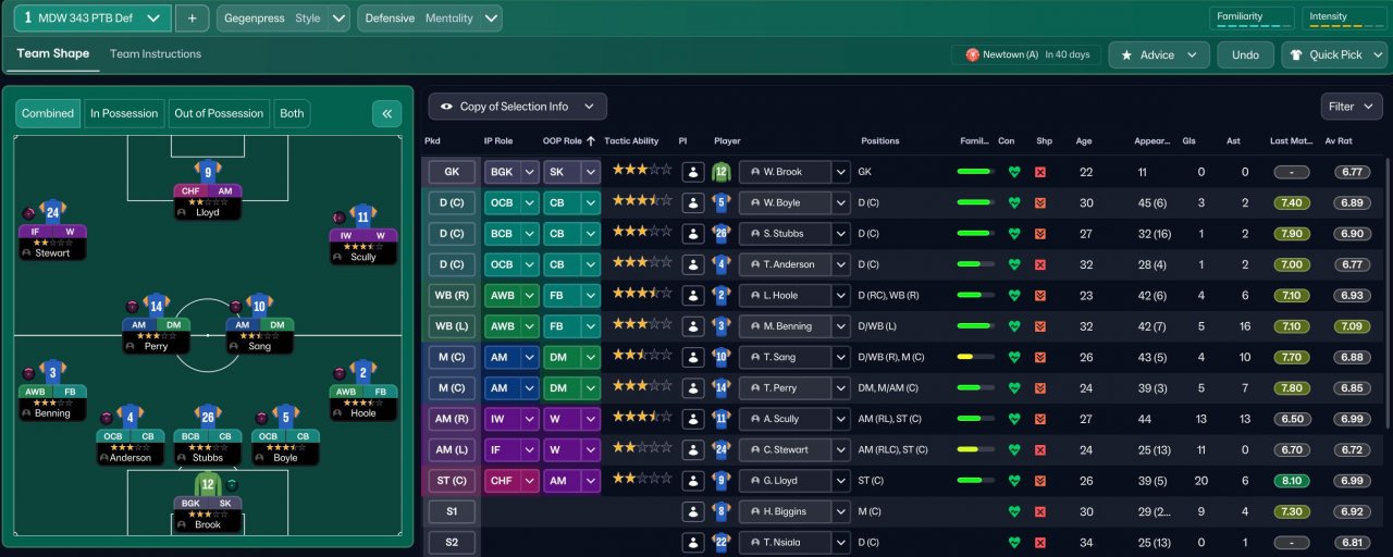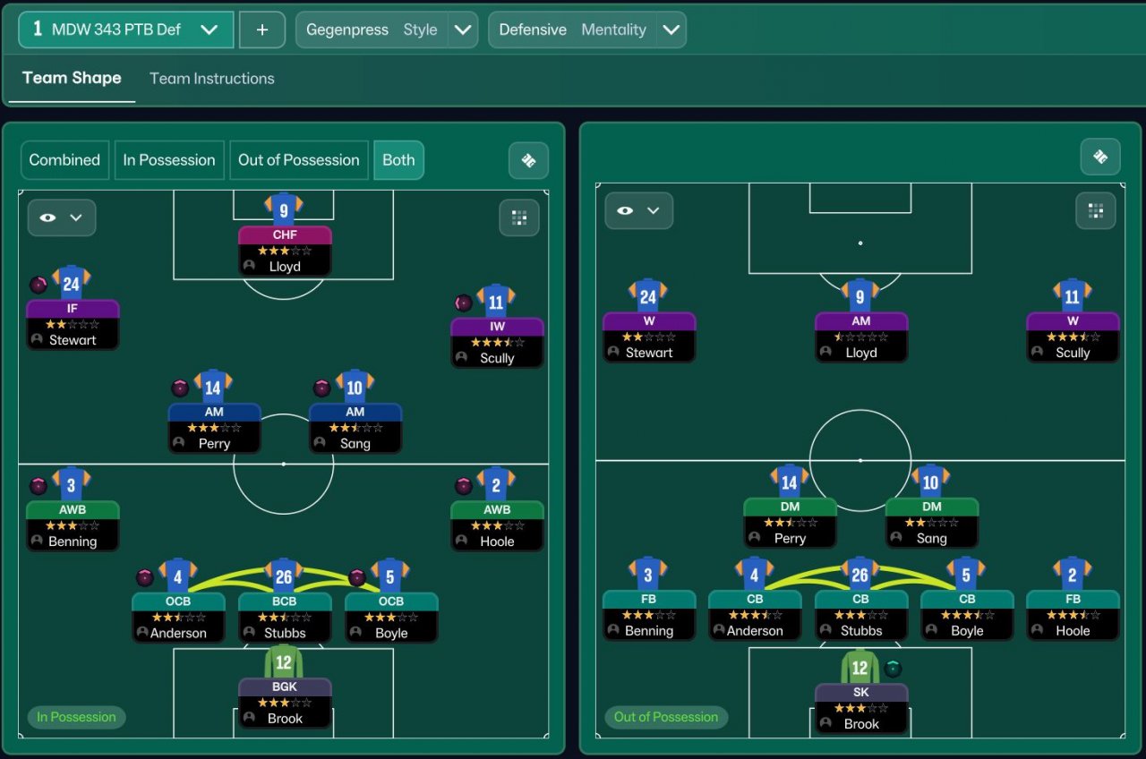An extension of my Mentality testing, with the original Defensive version of my Mentality testing tactic using a striker tactic based on Argus without PIs. I am looking to get a park the bus tactic by improving the Defensive version incorporating some of the team instructions from Bread's tactic without using PIs and trying to stick close to the original tactic.