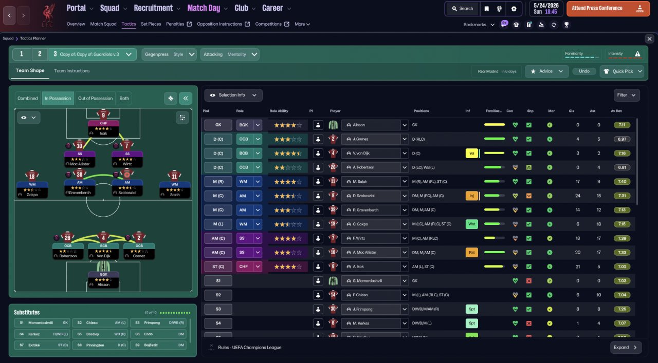 This is based off a formation that Pep liked to use while at Bayern. Unfortunately its really hard to play possession with current match engine. I did try to keep the striker this has done really well considering having a striker involved. I used the OP pi's with some minor tweaks here and there.