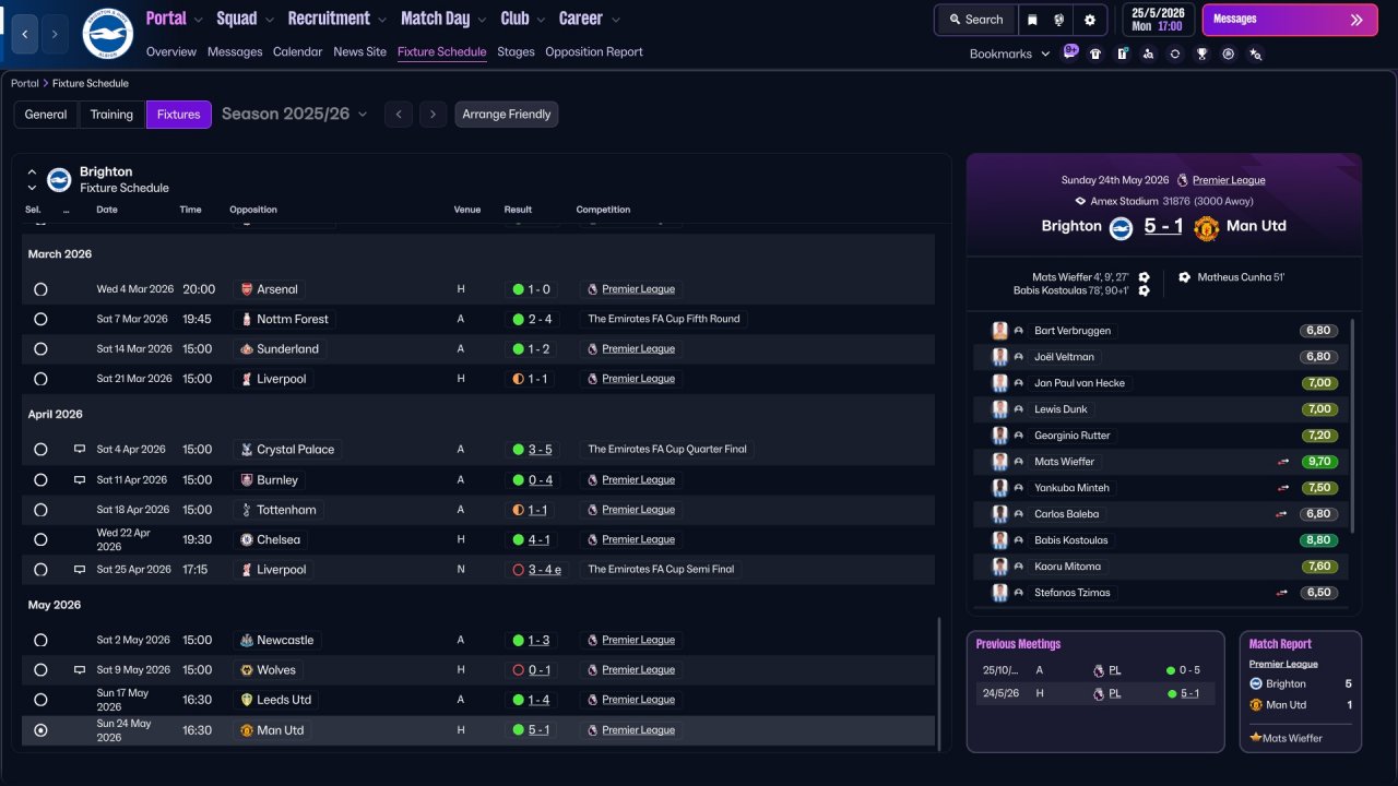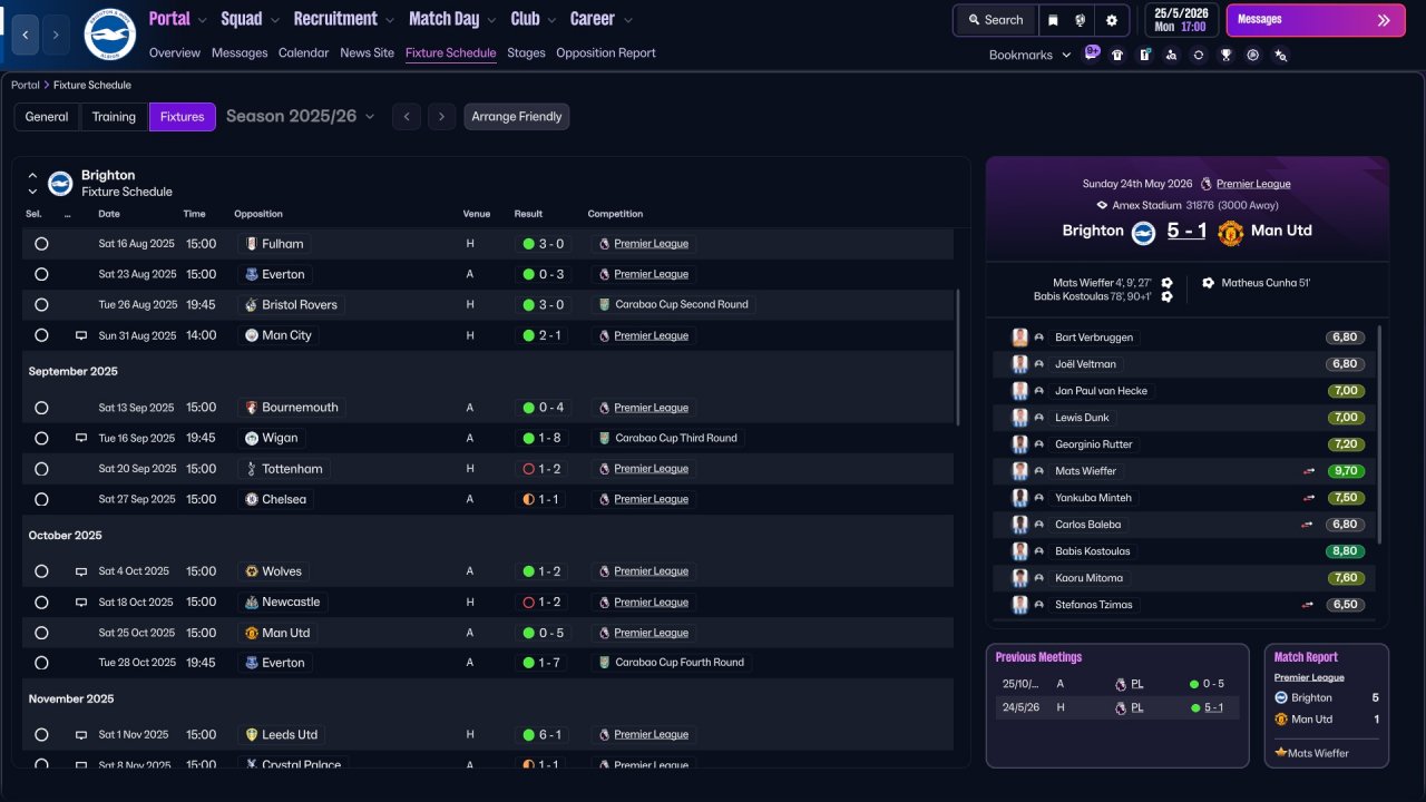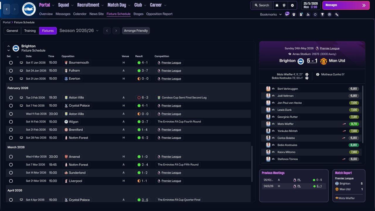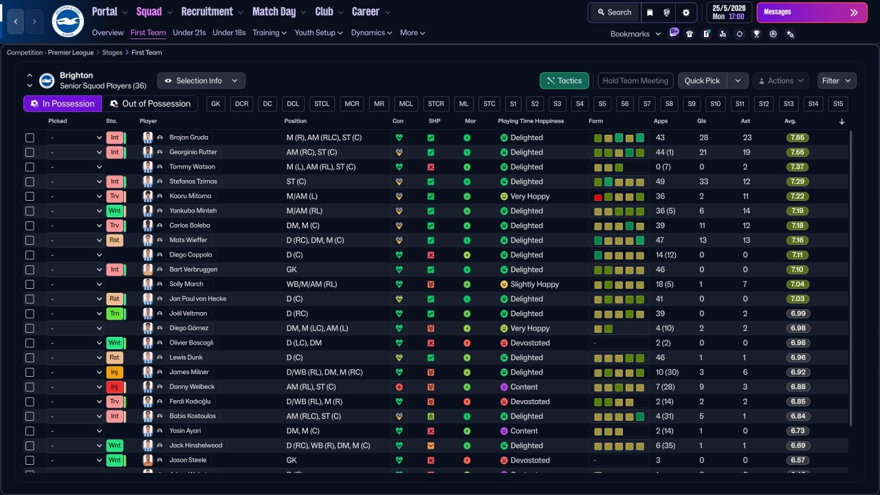 Another child of my Strikers + Wide Miedfielders family. Holiday testing with Brighton was quite mid, but want to test it anyway since some stats looks actually decent, and this might work better in a long run. Brighton lost a lot of points in games that should've be easily won. Still very decent performance from strikers. Central one scores the most of goals. Also as always decent performance from WMs, a role in which i fell in love this year (just like i fell for Hermione all these years ago).