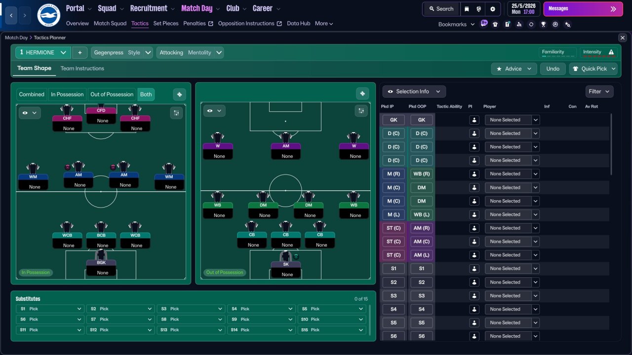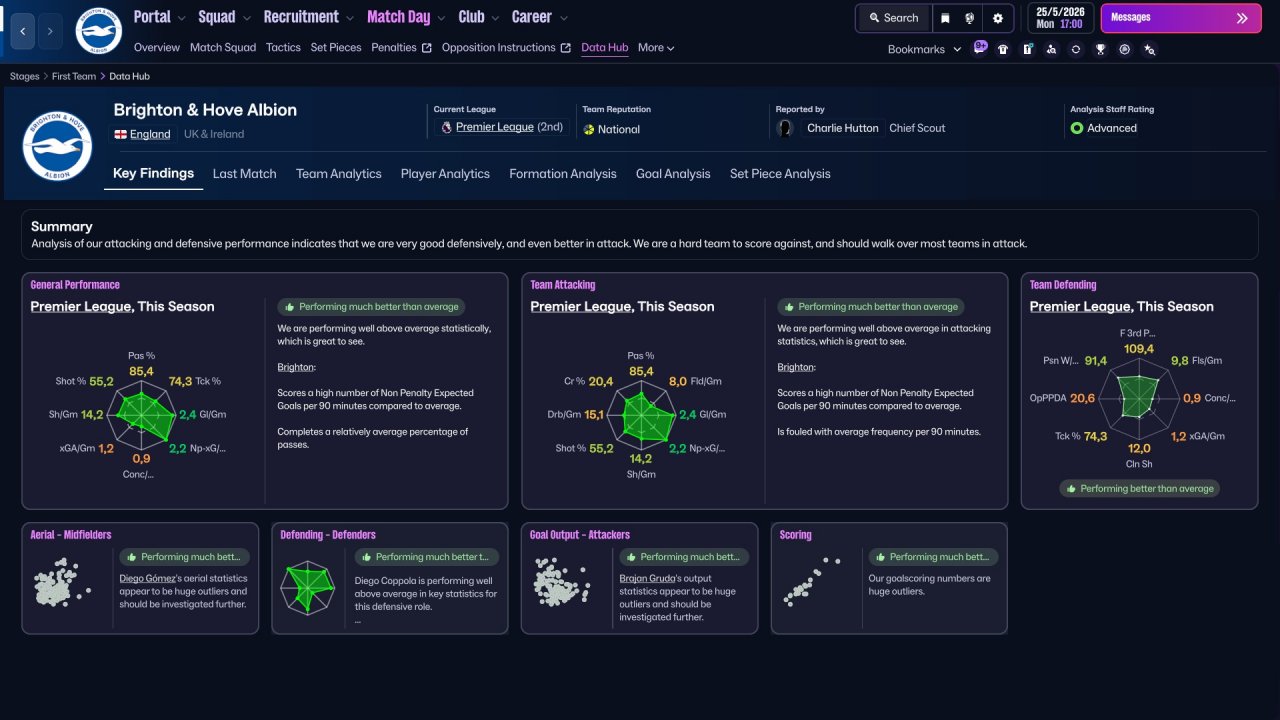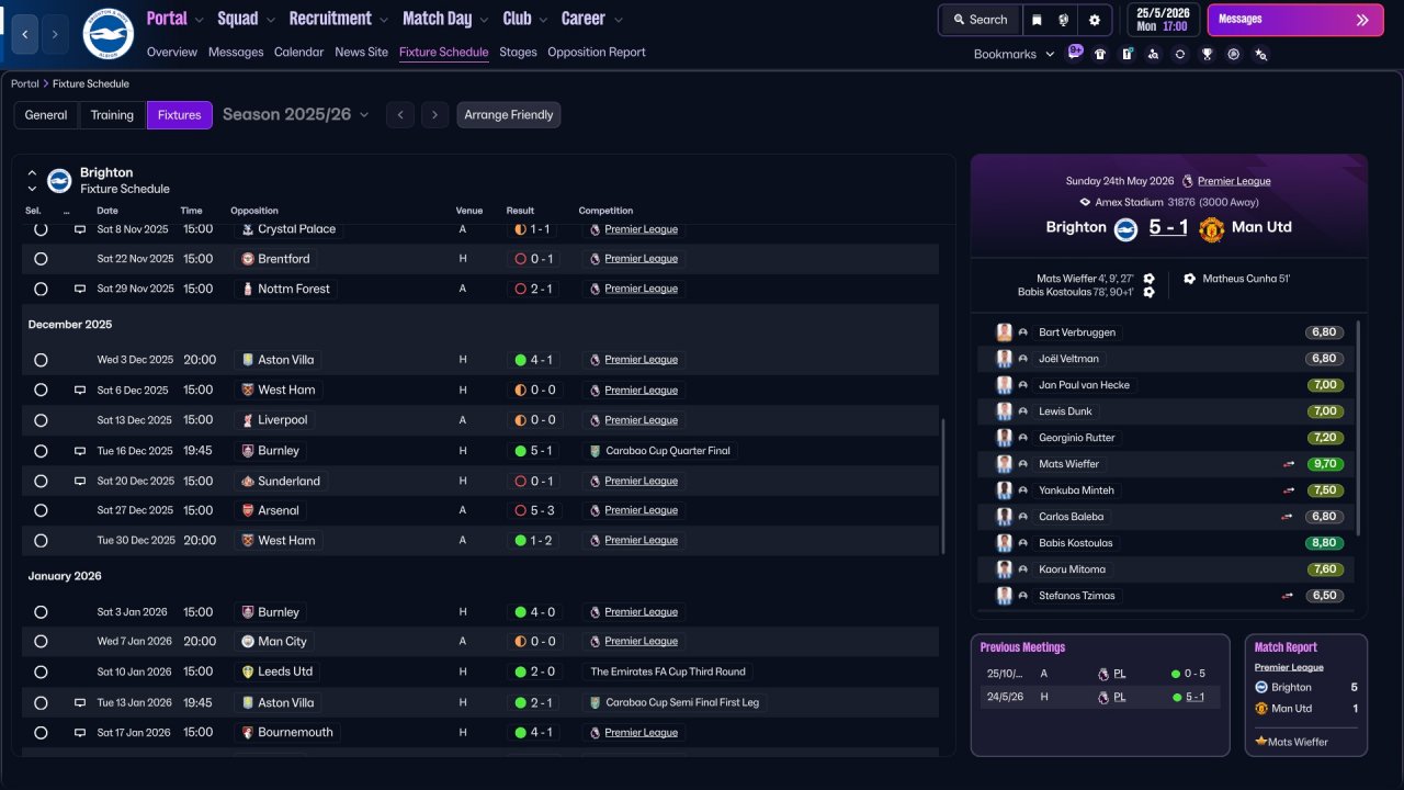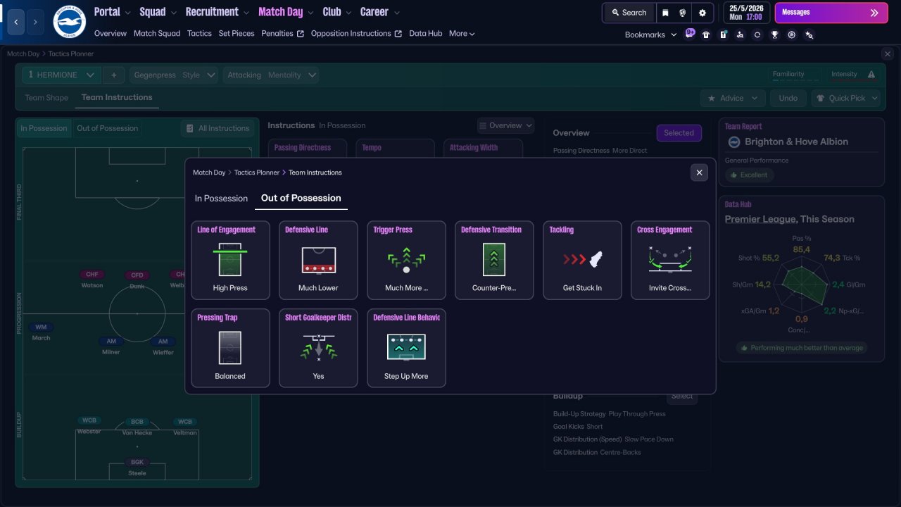 Another child of my Strikers + Wide Miedfielders family. Holiday testing with Brighton was quite mid, but want to test it anyway since some stats looks actually decent, and this might work better in a long run. Brighton lost a lot of points in games that should've be easily won. Still very decent performance from strikers. Central one scores the most of goals. Also as always decent performance from WMs, a role in which i fell in love this year (just like i fell for Hermione all these years ago).