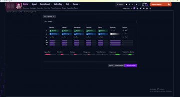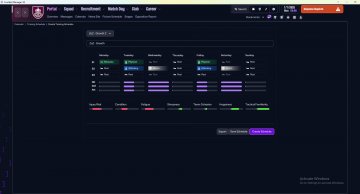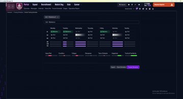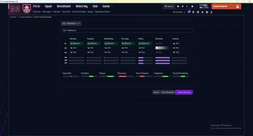 Below is my suggested training schedules, but feel free to adapt it to your own needs and preferences. Suggested TrainingSchedules Ideally split evenly during the season, alternating every week or month. Rebalance ([Resistance]): Redistributes CA among the most important attributes. Growth ([Physical]x5[Attacking]x5 for one match or [Physical]x2[Attacking]x2 for two matches): Improves secondary attributes, with focus on key attributes.