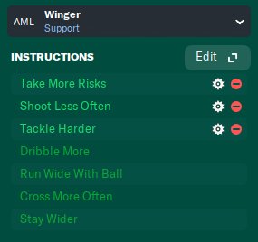 I just added one version with Wingers in AML/R position instead of Defensive Wingers. Roles are as shown in the picture. I have tested all roles to substitute DW, including Mezzala and Carrillero, and that role/position has the best performance, with similar results. Depending on your players, you can also mix and have one side with DW and another with advanced W.