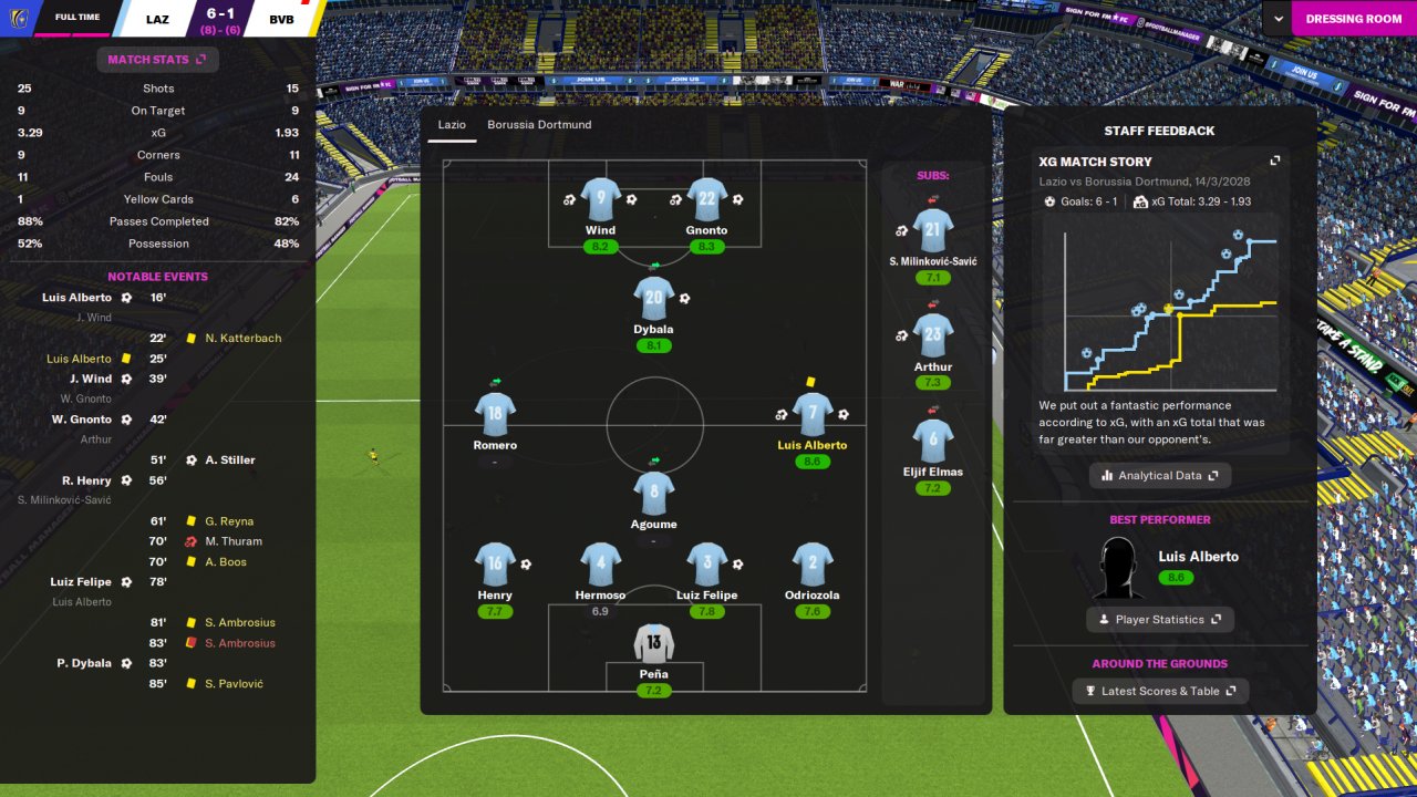 Blue 3.2 with my Lazio. Took them over season before this. Tons of debt, I just signed Gnonto and Arthur on a free. UCL against Dortmund, I turned it around.