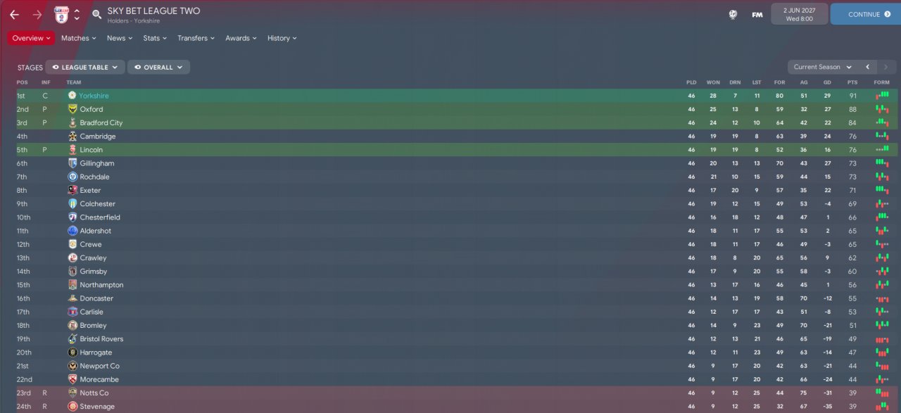 I was promoted from Vanarama National and this was the first season playing in Sky Bet League Two. I used ZaZ 3.4 AW. All games were played, no holiday mode. The only tricky thing was the discipline, I had a lot of yellow and red cards. Other than that, 3.4 AW is amazing! Expand