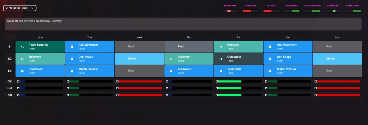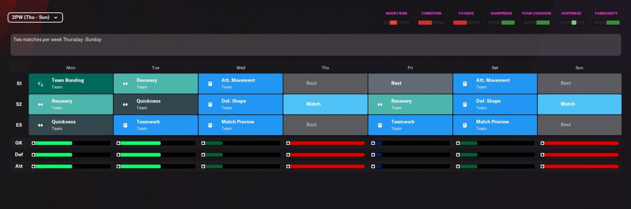 2. I see you covered the training schedules for 1,2 MPW and preseason. My question is, for example if you have 2 away games in a week you lose the Defensive Shape training for that week because travel is placed instead of it. Is that ok? And another thing is how would you structure the schedule for a week in which the matches are Wed - Sun or Thu - Sat or any of that variation. I have these 2 schedules that tackle this particular question, would you consider this approach ok for this point?