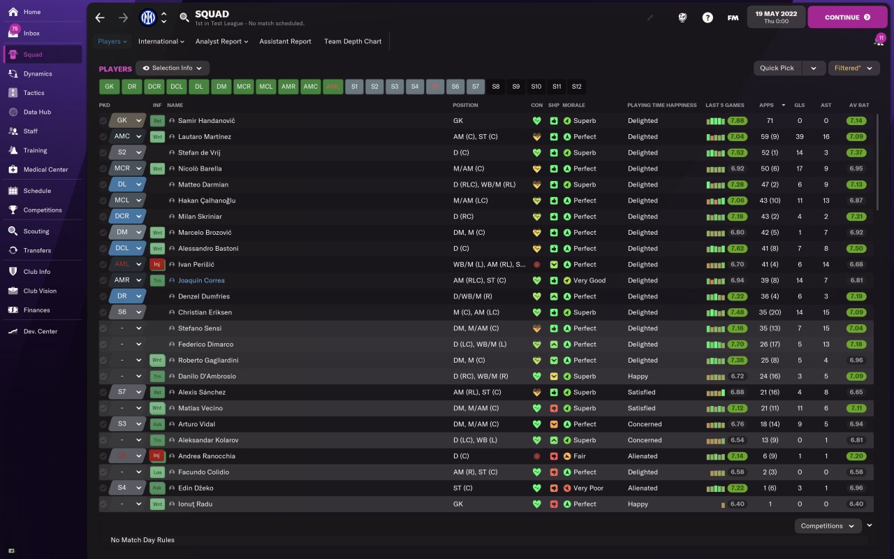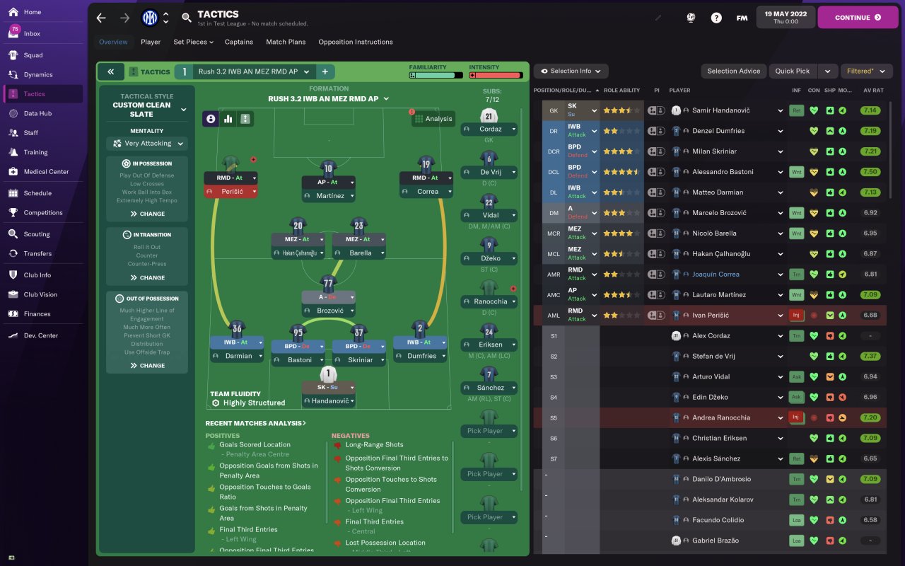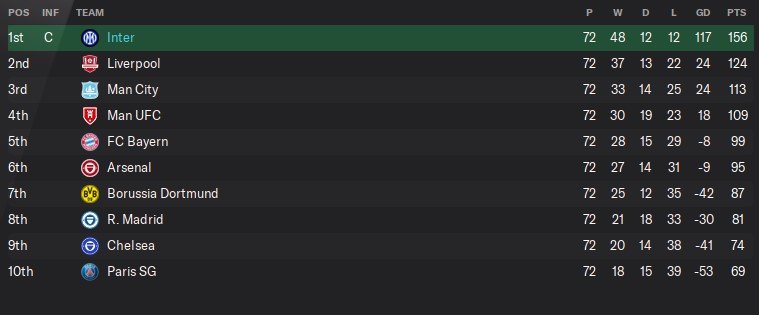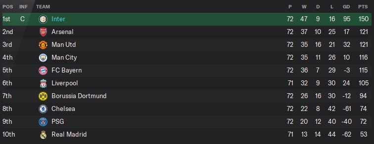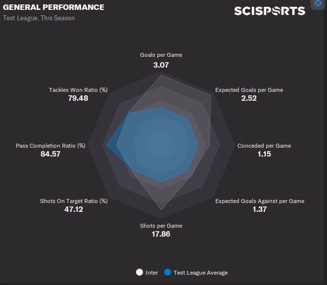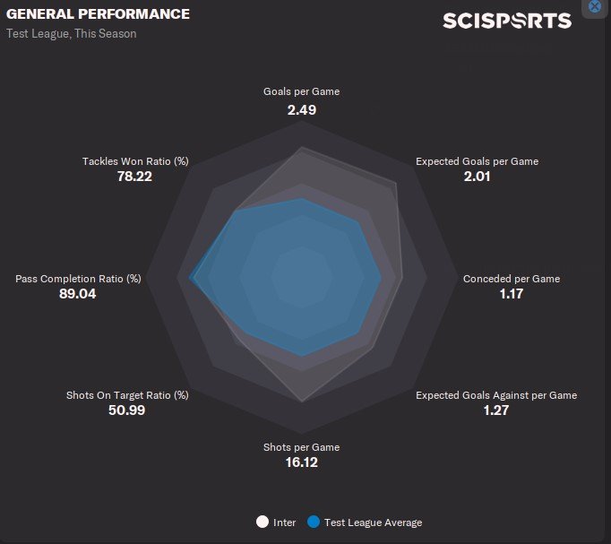 Collaborated with MomentaryBlink to share a testing database. Top 10 teams in the world, 76 game season, no continental or domestic cup competitions, all teams have injuries and suspensions wiped at the start of the test. Upper mid-table Inter was used for the tests to most closely mirror Team A and Team B in the FM-Arena tests.