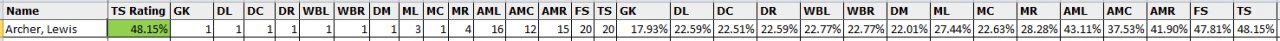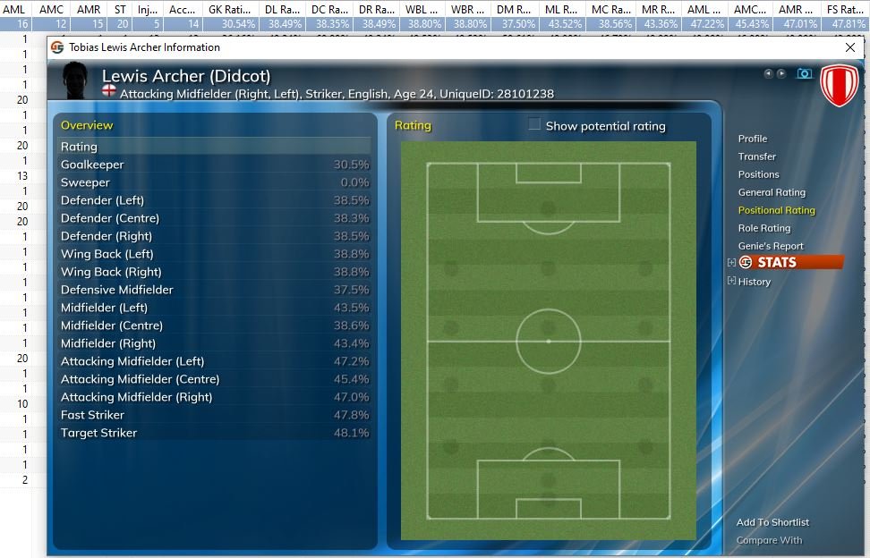 Here is a screenshot of one of my players from Genie Scout. Top left you can see the score out of 20 for the 4 attacking positions. Further along you see a rating for each position.
