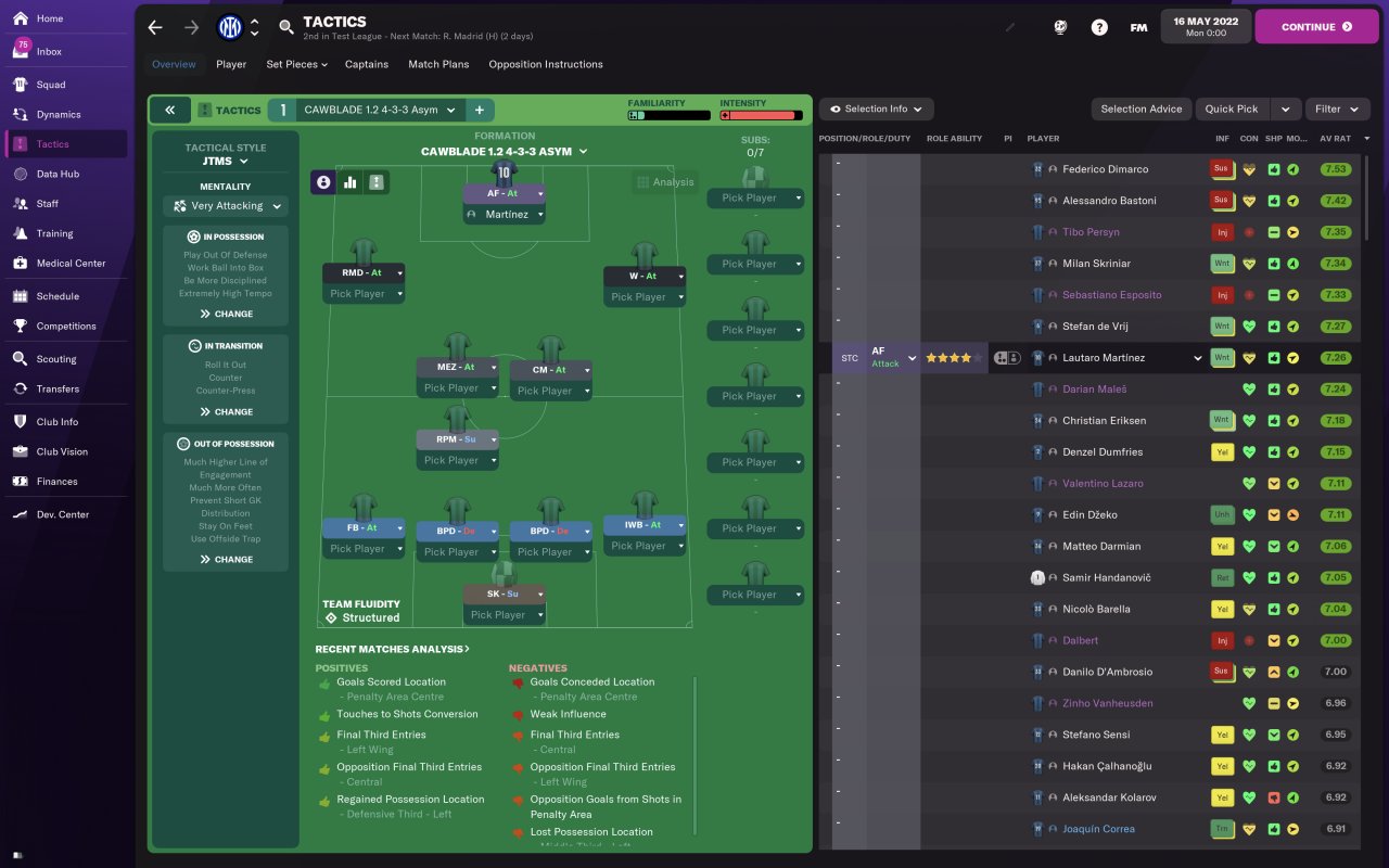 Back again using Dino's 10 team super league database. 72 game season. Tested with Inter. Forced Lautaro Martinez into the AF role to avoid Edin Dzeko being played there.