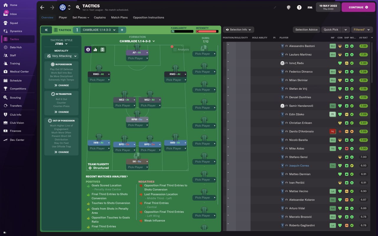Arrowhead seems to top out at 5.6, Blink never really arrived. So we move. The result is a 4-3-3 that marries some of the principles in Blink, Arrowhead, Zealot, and Dino's tactics. We've got ramdeuters, mezzalas, roaming playmakers, and inverted wing backs, hopefully it works for you.