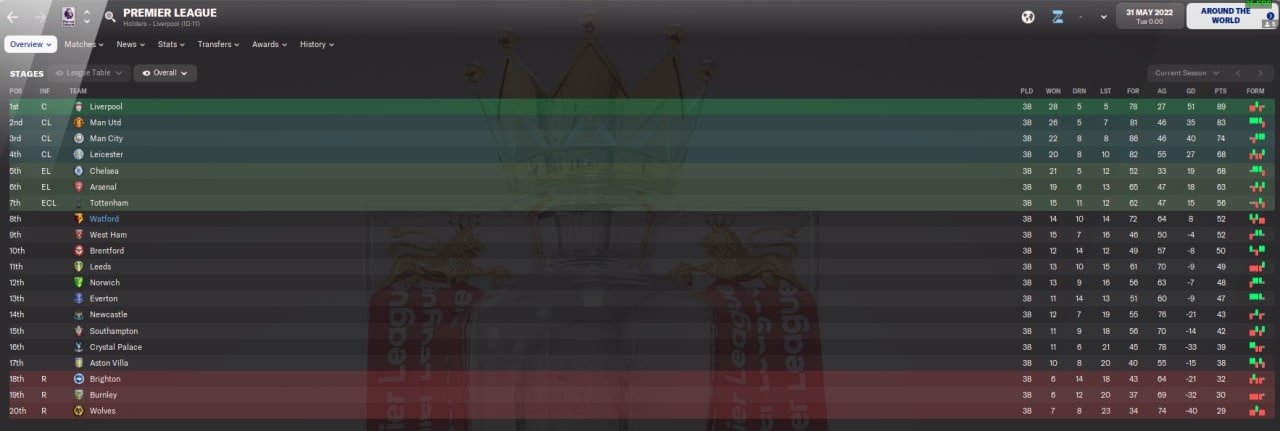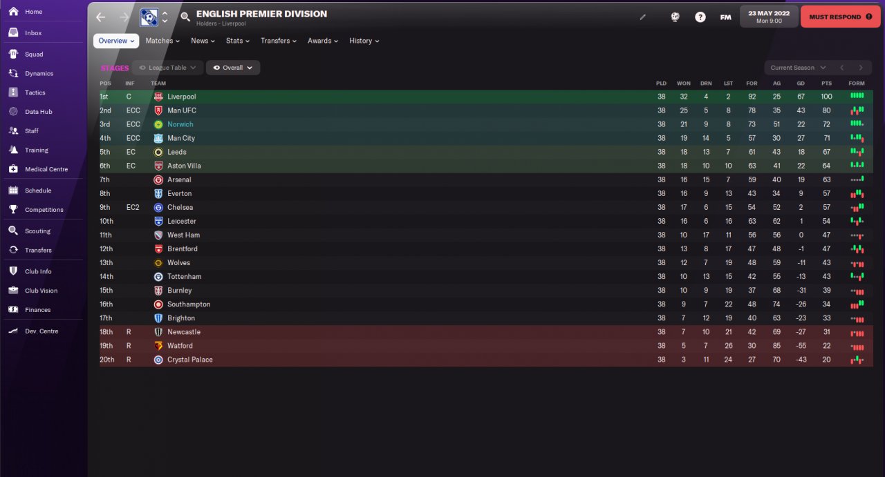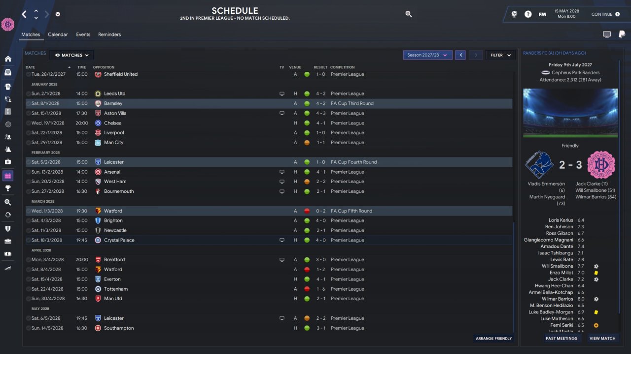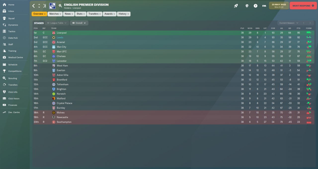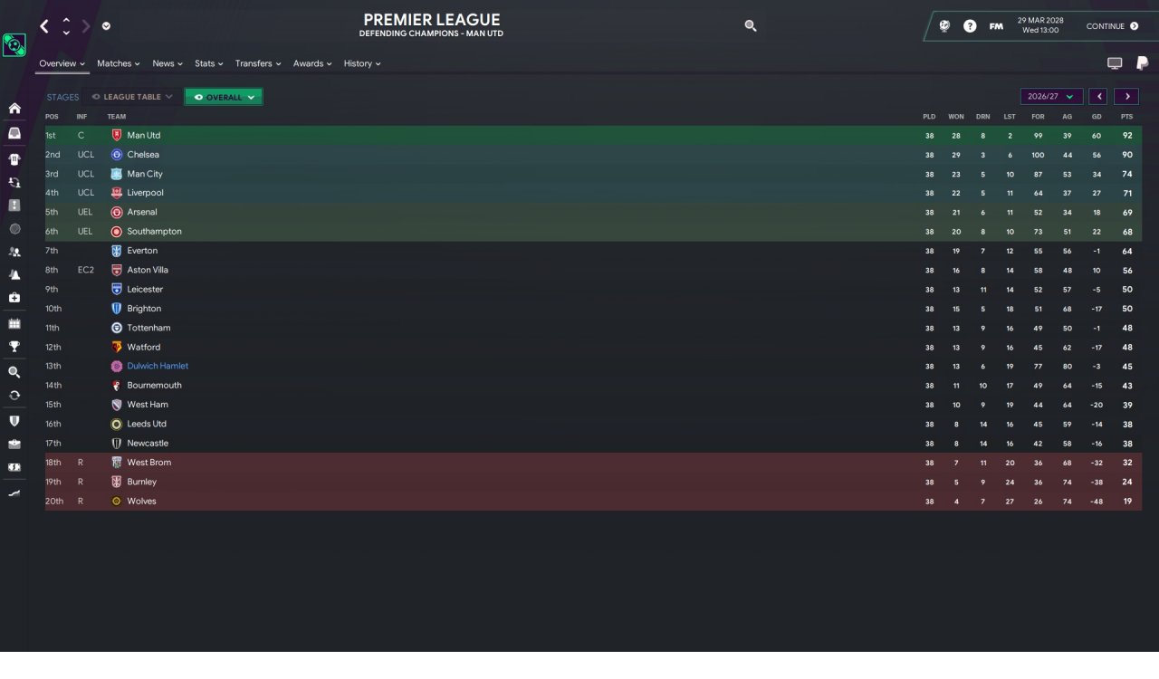 So i almost won the league in my second premier league season. Unfortunetly a injury for 6 months for my best player Rodrigo , coupled with some very poor away performances at totenham and watford made me fail to win the league. For next season i have a 59 million wage budget , from 49 million now and 80 million transfer budget. Again i am going to sell a bunch of players and buy new , better ones. With improvements to my full backs , gk and a quality striker i should win the league next season.