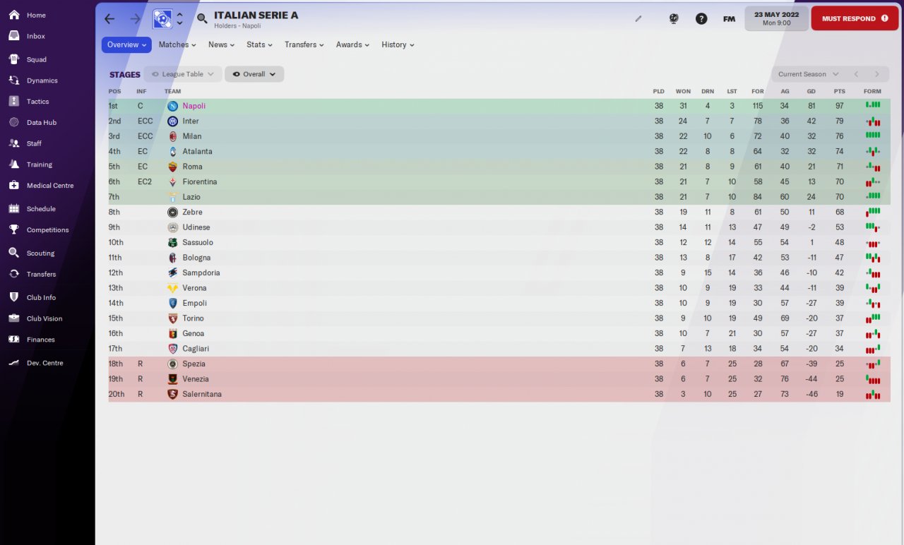 Unfortunetly a injury for 6 months for my best player Rodrigo , coupled with some very poor away performances at totenham and watford made me fail to win the league.