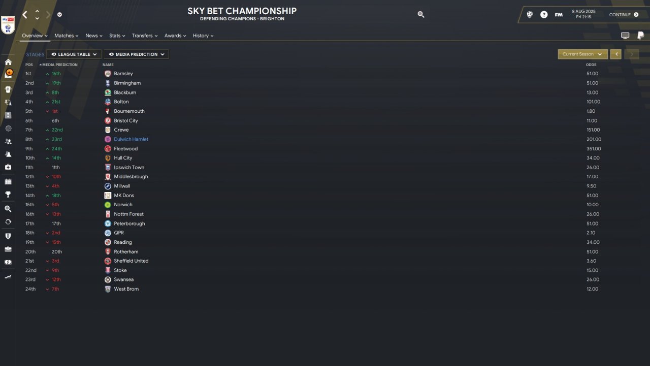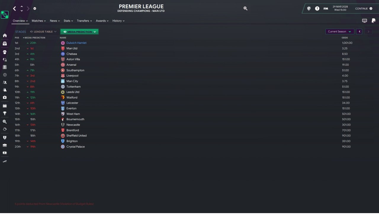 The first season in the premier league, it was brutal. Was given a salary budget of 25 million(almost 3 times less than the next team), with if i remember correctly 12 million or 22 million transfer budget , while my whole team was subpar. Bought a bunch of players and things looked dire at some point , even going 7 matches without winning while losing 6. But i survived in the end. Obviously media prediction last , by some margin.