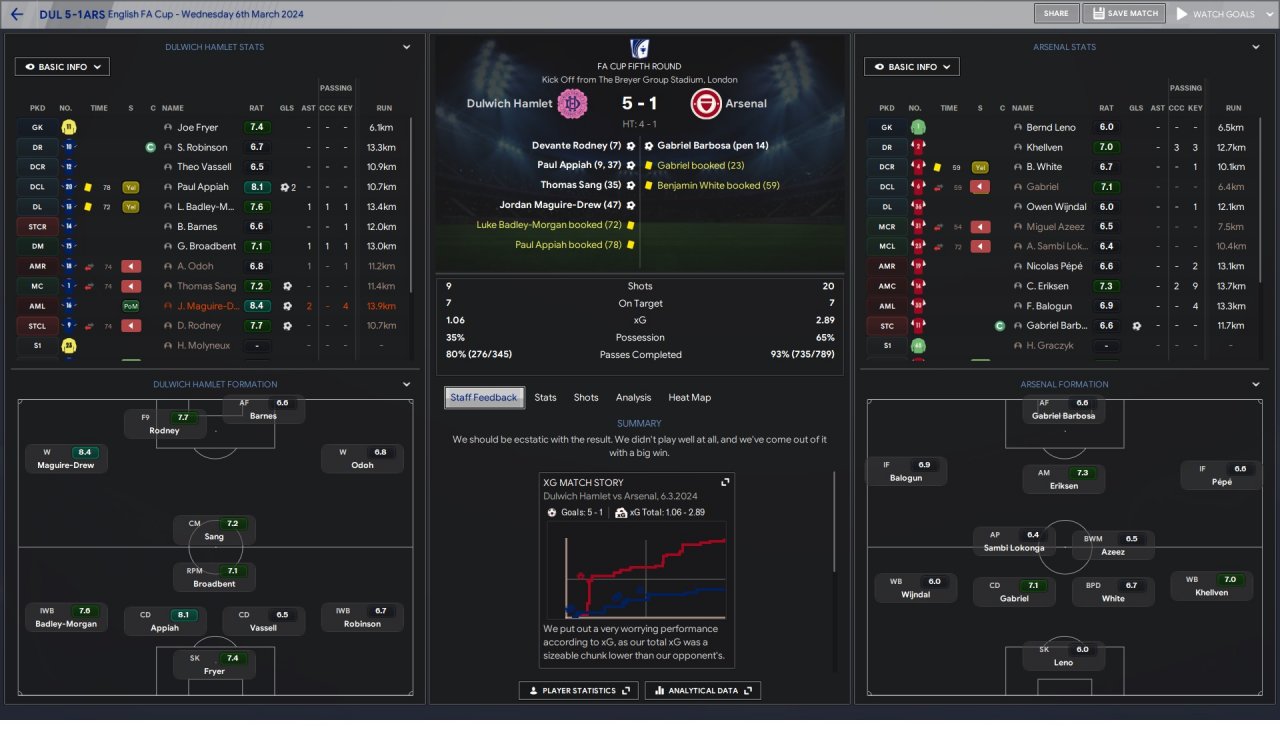 Also for some reason at this point(league 1) the game simply decided that i can't be drawn in the cups as a home team starting by round 3 or 4. I also won a game against arsenal as a league 2 team , at home after arteta said i was a weak team, by best result at that point.