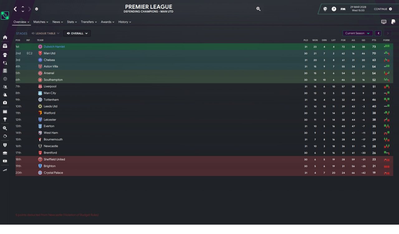 Second season my board bumped my salary budget to 45 million and transfer budget of around 36 million and boy did it show . Still predicted dead last, by some margin. I can potentially win the league with some luck. I believe man utd have a harder schedule , with the remaining game against me , in my home. I managed to drastically improve my defense , with most of my budget going in the cd positions.Bought some has-been's and somehow started dominating again.